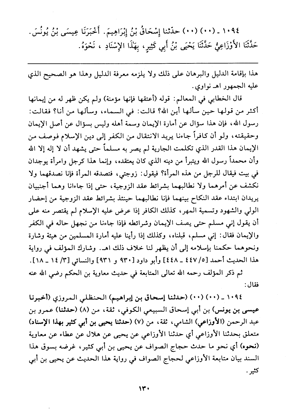 ١٠٩٤ - (٠٠) (٠٠) (حدثنا (سحاق بن (براهيم) الحنظلي المروزي (أخبرنا عيسى بن يونس) بن أبي إسحاق السبيعي الكوفي، ثقة، من (٨) (حدثنا) عمرو بن عبد الرحمن (الأوزاعي) الشامي، ثقة، من (٧) (حدثنا يحيى بن أبي كثير بهذا الإسناد) متعلق بحدثنا الأوزاعي أي حدثنا الأوزاعي عن يحيى عن هلال عن عطاء عن معاوية (نحوه) أي نحو ما حدث حجاج الصواف عن يحيى بن أبي كثير، غرضه بسوق هذا السند بيان متابعة الأوزاعي لحجاج الصواف في رواية هذا الحديث عن يحيى بن أبي كثير.