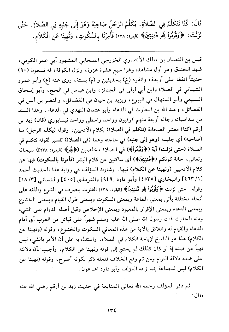 قيس بن النعمان بن مالك الأنصاري الخزرجي الصحابي المشهور أبي عمر الكوفي، شهد الخندق وهو أول مشاهده وغزا سبع عشرة غزوة، ونزل الكوفة، له تسعون (٩٠) حديثًا اتفقا على أربعة، وانفرد (خ) بحديثين و (م) بستة، روى عنه (ع) وأبو عمرو الشيباني في الصلاة وابن أبي ليلى في الجنائز، وابن عباس في الحج، وأبو إسحاق السبيعي وأبو المنهال في البيوع، ويزيد بن حيان في الفضائل، والنضر بن أنس في الفضائل، وعبد الله بن الحارث في الدعاء وأبو عثمان النهدي في الدعاء. وهذا السند من سداسياته رجاله أربعة منهم كوفيون وواحد واسطي وواحد نيسابوري (قال) زيد بن أرقم (كنا) معشر الصحابة (نتكلم في الصلاة) بكلام الآدميين، وقوله (يكلم الرجل) منا (صاحبه) أي جليسه (وهو إلى جنبه) في حاجته وهما (في الصلاة) تفسير لقوله نتكلم في الصلاة (حتى نزلت) آية {وَقُومُوا} في الصلاة مخلصين {لِلَّهِ} [البقرة: ٢٣٨)] سبحانه وتعالى، حالة كونكم {قَانِتِينَ} أي ساكتين عن كلام البشر (فأمرنا بالسكوت) فيها عن كلام الآدميين (ونهينا عن الكلام) فيها. وشارك المؤلف في رواية هذا الحديث أحمد [١/ ٤٦٣] والبخاري [٤٥٣٥]، وأبو داود [٩٤٩]، والترمذي [٤٠٥]، والنسائي [٣/ ١٨] وقوله: حتى نزلت {وَقُومُوا لِلَّهِ قَانِتِينَ} [البقرة: ٢٣٨] القنوت ينصرف في الشرع واللغة على أنحاء مختلفة يأتي بمعنى الطاعة وبمعنى السكوت وبمعنى طول القيام وبمعنى الخشوع وبمعنى الدعاء وبمعنى الإقرار بالمعبود وبمعنى الإخلاص وقيل أصله الدوام على الشيء ومنه الحديث قنت رسول الله صلى الله عليه وسلم شهرًا على قبائل من العرب أي أدام الدعاء والقيام له واللائق بالآية من هذه المعاني السكوت والخشوع، وقوله (ونهينا عن الكلام) هذا هو الناسخ لإباحة الكلام في الصلاة، واستدل به على أن الأمر بالشيء ليس نهيًا عن ضده إذ لو كان كذلك لم يحتج إلى قوله ونهينا عن الكلام، وأجيب بأن دلالته على ضده دلالة التزام ومن ثم وقع الخلاف فلعله ذكر لكونه أصرح، وقوله (نهينا عن الكلام) ليس للجماعة إنما زاده المؤلف وأبو داود اهـ عون.