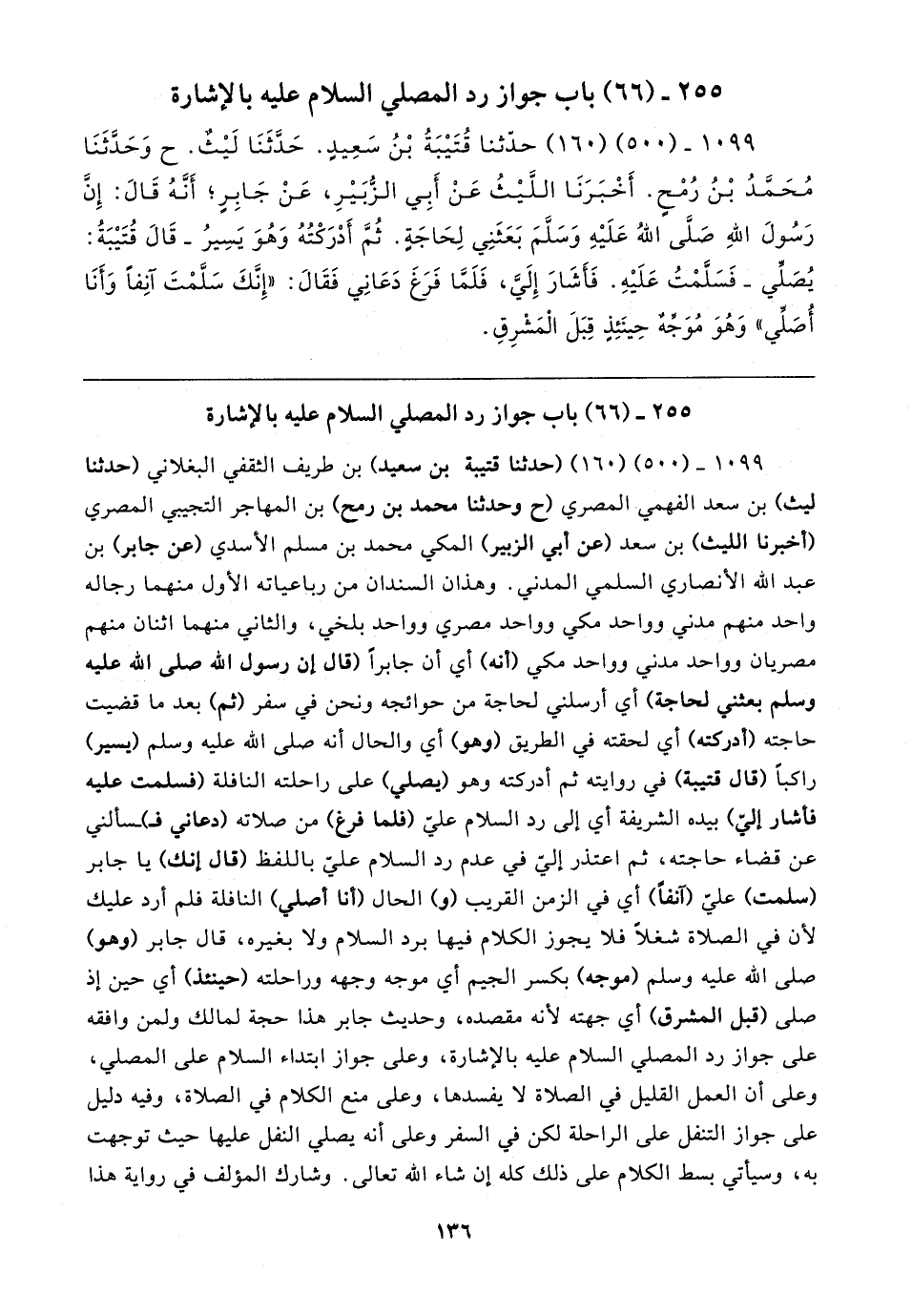 ١٠٩٩ - (٥٠٠) (١٦٠) حدثنا قُتَيبَةُ بْنُ سَعِيدٍ. حَدَّثَنَا لَيثٌ. ح وَحَدَثَنَا مُحَمَّدُ بْنُ رُمْحٍ. أَخْبَرَنَا اللَّيثُ عَنْ أَبِي الزبَيرِ، عَنْ جَابِرِ؛ أَنَّهُ قَال: إِن رَسُولَ الله - صلى الله عليه وسلم - بَعَثَنِي لِحَاجَةٍ. ثُم أَدْرَكْتُهُ وَهُوَ يَسِيرُ -قَال قُتَيبَةُ: يُصَلِّي- فَسَلَّمْتُ عَلَيهِ. فَأَشَارَ إِلَيَّ، فَلَمَّا فرَغَ دَعَانِي فَقَال: "إِنَكَ سَلَّمْتَ آنِفًا وَأَنَا أُصَلِّي" وَهُوَ مُوَجِّهٌ حِينَئِذٍ قِبَلَ الْمَشْرِقِ