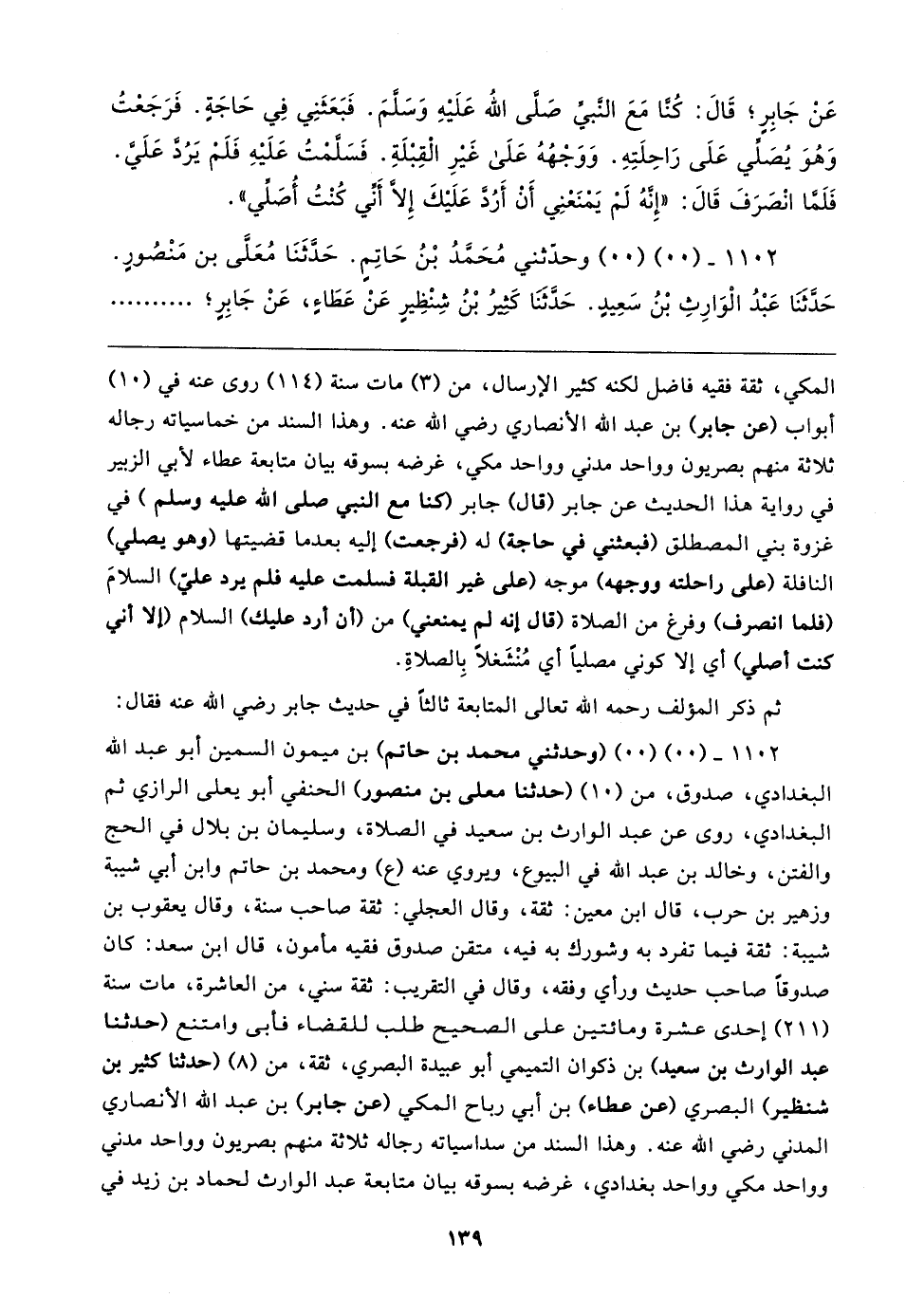 ١١٠٢ - (٠٠) (٠٠) (وحدثني محمد بن حاتم) بن ميمون السمين أبو عبد الله البغدادي، صدوق، من (١٠) (حدثنا معلي بن منصور) الحنفي أبو يعلى الرازي ثم البغدادي، روى عن عبد الوارث بن سعيد في الصلاة، وسليمان بن بلال في الحج والفتن، وخالد بن عبد الله في البيوع، ويروي عنه (ع) ومحمد بن حاتم وابن أبي شيبة وزهير بن حرب، قال ابن معين: ثقة، وقال العجلي: ثقة صاحب سنة، وقال يعقوب بن شيبة: ثقة فيما تفرد به وشورك به فيه، متقن صدوق فقيه مأمون، قال ابن سعد: كان صدوقًا صاحب حديث ورأي وفقه، وقال في التقريب: ثقة سني، من العاشرة، مات سنة (٢١١) إحدى عشرة ومائتين على الصحيح طلب للقضاء فأبى وامتنع (حدثنا عبد الوارث بن سعيد) بن ذكوان التميمي أبو عبيدة البصري، ثقة، من (٨) (حدثنا كثير بن شنظير) البصري (عن عطاء) بن أبي رباح المكي (عن جابر) بن عبد الله الأنصاري المدني رضي الله عنه. وهذا السند من سداسياته رجاله ثلاثة منهم بصريون وواحد مدني وواحد مكي وواحد بغدادي، غرضه بسوقه بيان متابعة عبد الوارث لحماد بن زيد في