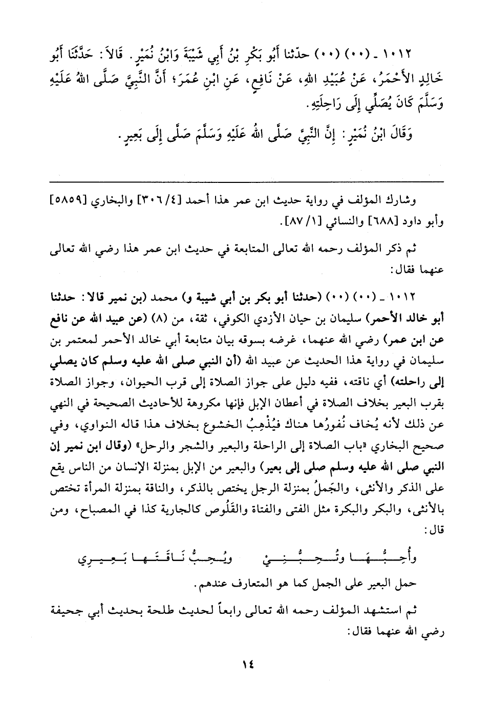 ١٠١٢ - (٠٠) (٠٠) حدَّثنا أَبُو بَكْرِ بْنُ أَبِي شَيبَةَ وَابْنُ نُمَيرٍ. قَالا: حَدَّثنَا أَبُو خَالِدٍ الأَحْمَرُ، عَنْ عُبَيدِ اللهِ، عَنْ نَافِعٍ، عَنِ ابْنِ عُمَرَ؛ أَنَّ النَّبِيَّ صَلَّى اللهُ عَلَيهِ وَسَلَّمَ كَانَ يُصَلِّي إِلَى رَاحِلَتِهِ.