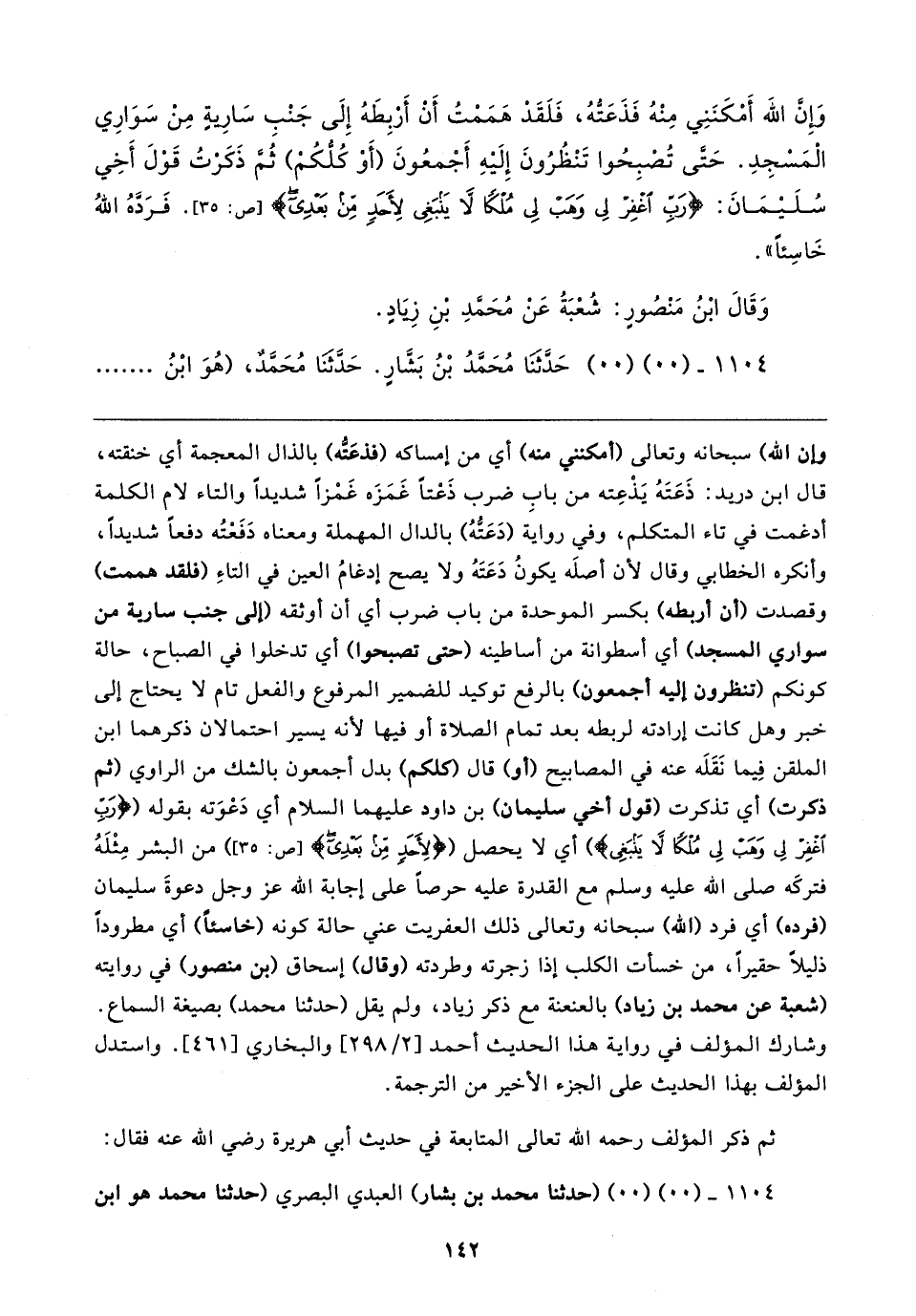 وَإن اللَّه أَمْكَنَنِي مِنْهُ فَذَعَتُّهُ، فَلَقَدْ هَمَمْتُ أَن أربِطَهُ إِلَى جَنْبِ سَارِيةٍ مِنْ سَوَارِي الْمَسْجِدِ. حَتى تُصْبِحُوا تَنْظُرُونَ إِلَيهِ اجْمعُونَ (أوْ كُلكُمْ) ثُم ذَكَرتُ قَوْلَ أَخِي سُلَيمَانَ: {قَال رَبِّ اغْفِرْ لِي وَهَبْ لِي مُلْكًا لَا يَنْبَغِي لِأَحَدٍ مِنْ بَعْدِي} [ص: ٣٥]. فَرَدَّهُ اللهُ خَاسِئًا".