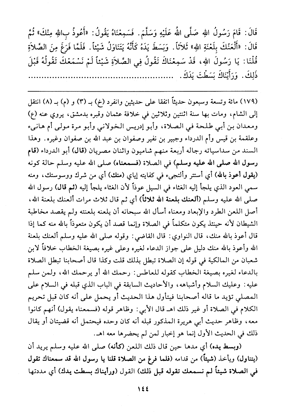 (١٧٩) مائة وتسعة وسبعون حديثًا اتفقا على حديثين وانفرد (خ) بـ (٣) و (م) بـ (٨) انتقل إلى الشام، ومات بها سنة اثنتين وثلاثين في خلافة عثمان وقبره بدمشق، يروي عنه (ع) ومعدان بن أبي طلحة في الصلاة، وأبو إدريس الخولاني وأبو مرة مولى أم هانئ وعلقمة بن قيس وأم الدرداء وجبير بن نفير وصفوان بن عبد الله بن صفوان وغيره. وهذا السند من سداسياته رجاله أربعة منهم شاميون واثنان مصريان (قال) أبو الدرداء (قام رسول الله صلى الله عليه وسلم) في الصلاة (فسمعناه) صلى الله عليه وسلم حالة كونه (يقول أعوذ بالله) أي أستتر وألتجئ في كفايته إياي (منك) أي من شرك ووسوستك، ومنه سمي العود الذي يلجأ إليه الغثاء في السيل عوذا لأن الغثاء يلجأ إليه (ثم قال) رسول الله صلى الله عليه وسلم (ألعنك بلعنة الله ثلاثًا) أي ثم قال ثلاث مرات ألعنك بلعنة الله، أصل اللعن الطرد والإبعاد ومعناه أسأل الله سبحانه أن يلعنه بلعنته ولم يقصد مخاطبة الشيطان لأنه حينئذ يكون متكلما في الصلاة د انما قصد أن يكون متعوذا بالله منه كما إذا قال أعوذ بالله منك، قال النواوي: قال القاضي: وقوله صلى الله عليه وسلم ألعنك بلعنة الله وأعوذ بالله منك دليل على جواز الدعاء لغيره وعلى غيره بصيغة الخطاب خلافًا لابن شعبان من المالكية في قوله إن الصلاة تبطل بذلك قلت وكذا قال أصحابنا تبطل الصلاة بالدعاء لغيره بصيغة الخطاب كقوله للعاطس: رحمك الله أو يرحمك الله، ولمن سلم عليه: وعليك السلام وأشباهه، والأحاديث السابقة في الباب الذي قبله في السلام على المصلي تؤيد ما قاله أصحابنا فيتأول هذا الحديث أو يحمل على أنه كان قبل تحريم الكلام في الصلاة أو غير ذلك اهـ قال الأبي: وظاهر قوله (فسمعناه يقول) أنهم كانوا معه، وظاهر حديث أبي هريرة المذكور قبله أنه كان وحده فيحتمل أنه قضيتان أو يقال ذلك في الحديث الأول إنما هو إخبار لمن لم يحضرها معه اهـ.