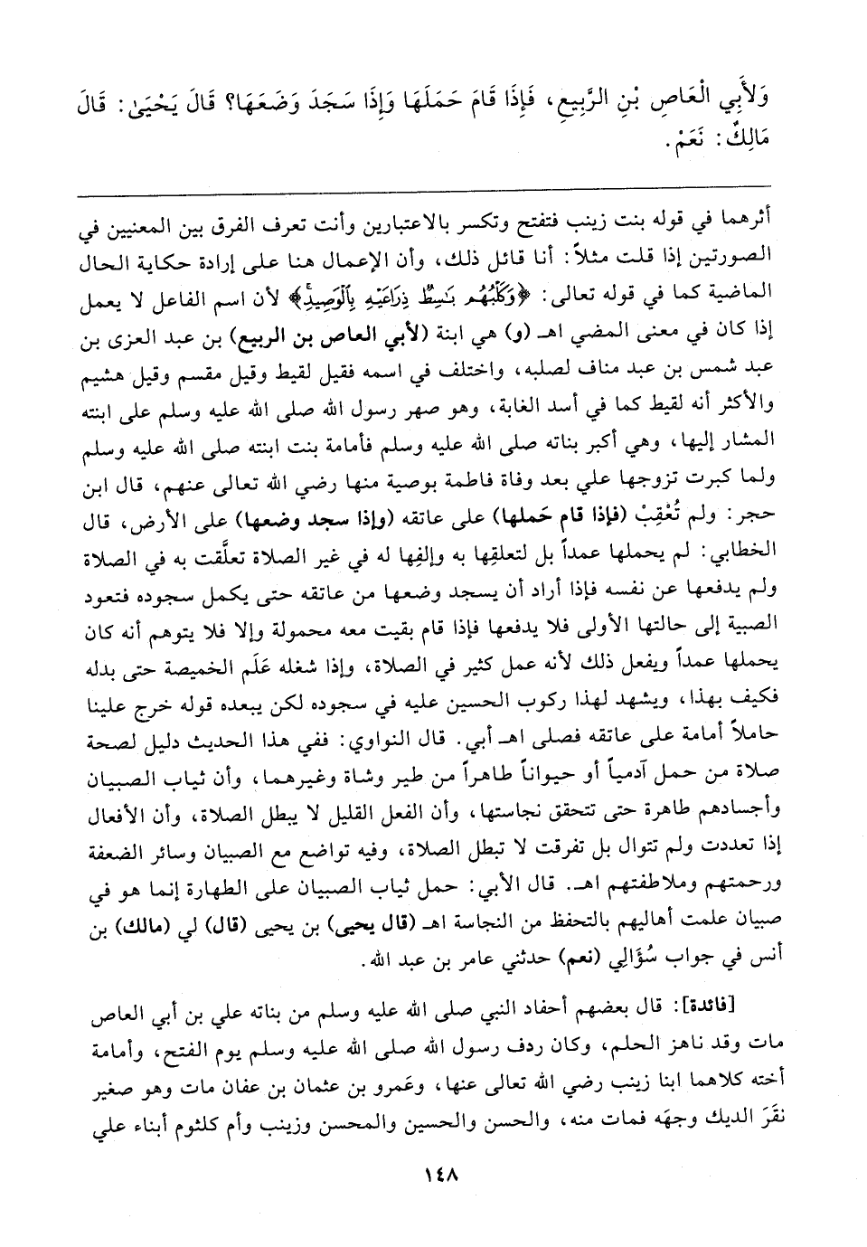 أثرهما في قوله بنت زينب فتفتح وتكسر بالاعتبارين وأنت تعرف الفرق بين المعنيين في الصورتين إذا قلت مثلًا: أنا قائل ذلك، وأن الإعمال هنا على إرادة حكاية الحال الماضية كما في قوله تعالى: {وَكَلْبُهُمْ بَاسِطٌ ذِرَاعَيهِ بِالْوَصِيد} لأن اسم الفاعل لا يعمل إذا كان في معنى المضي اهـ (و) هي ابنة (لأبي العاص بن الربيع) بن عبد العزى بن عبد شمس بن عبد مناف لصلبه، واختلف في اسمه فقيل لقيط وقيل مقسم وقيل هشيم والأكثر أنه لقيط كما في أسد الغابة، وهو صهر رسول الله صلى الله عليه وسلم على ابنته المشار إليها، وهي أكبر بناته صلى الله عليه وسلم فأمامة بنت ابنته صلى الله عليه وسلم ولما كبرت تزوجها علي بعد وفاة فاطمة بوصية منها رضي الله تعالى عنهم، قال ابن حجر: ولم تُعْقِبْ (فإذا قام حَملها) على عاتقه (وإذا سجد وضعها) على الأرض، قال الخطابي: لم يحملها عمدًا بل لتعلقِها به وإلفِها له في غير الصلاة تعلَّقت به في الصلاة ولم يدفعها عن نفسه فإذا أراد أن يسجد وضعها من عاتقه حتى يكمل سجوده فتعود الصبية إلى حالتها الأولى فلا يدفعها فإذا قام بقيت معه محمولة وإلا فلا يتوهم أنه كان يحملها عمدًا ويفعل ذلك لأنه عمل كثير في الصلاة، وإذا شغله عَلَم الخميصة حتى بدله فكيف بهذا، ويشهد لهذا ركوب الحسين عليه في سجوده لكن يبعده قوله خرج علينا حاملا أمامة على عاتقه فصلى اهـ أبي. قال النواوي: ففي هذا الحديث دليل لصحة صلاة من حمل آدميًّا أو حيوانًا طاهرًا من طير وشاة وغيرهما، وأن ثياب الصبيان وأجسادهم طاهرة حتى تتحقق نجاستها، وأن الفعل القليل لا يبطل الصلاة، وأن الأفعال إذا تعددت ولم تتوال بل تفرقت لا تبطل الصلاة، وفيه تواضع مع الصبيان وسائر الضعفة ورحمتهم وملاطفتهم اهـ. قال الأبي: حمل ثياب الصبيان على الطهارة إنما هو في صبيان علمت أهاليهم بالتحفظ من النجاسة اهـ (قال يحيى) بن يحيى (قال) لي (مالك) بن أنس في جواب سُؤَالِي (نعم) حدثني عامر بن عبد الله.