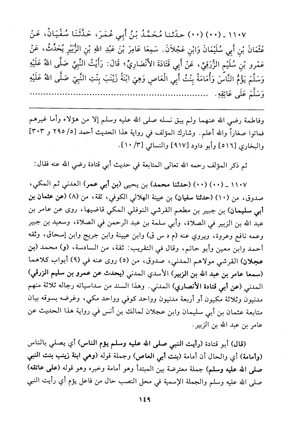 ١١٠٧ - (٠٠) (٠٠) حدثنا مُحَمّدُ بْنُ أَبِي عُمَرَ، حَدَّثَنَا سُفْيَانُ، عَنْ عثْمَانَ بْنِ أَبِي سُلَيمَانَ وَابْنِ عَجْلانَ. سَمِعَا عَامِرَ بْنَ عَبْدِ اللهِ بْنِ الزُّبَيرِ يُحَدثُ، عَنْ عَمْرو بْنِ سُلَيمٍ الزُّرَقِي، عَنْ أَبِي قَتَادَةَ الأَنْصَارِي؛ قَال: رَأَيتُ النَّبِى صَلَّى اللهُ عَلَيهِ وَسَلَّمَ يَؤُمُّ النَّاسَ وَأُمَامَةُ بِنْتُ أَبِي الْعَاصِ وَهِيَ ابْنَةُ زَينَبَ بِنْتِ النَّبِيّ صَلَى اللهُ عَلَيهِ وَسَلَّمَ عَلَى عَاتِقِهِ