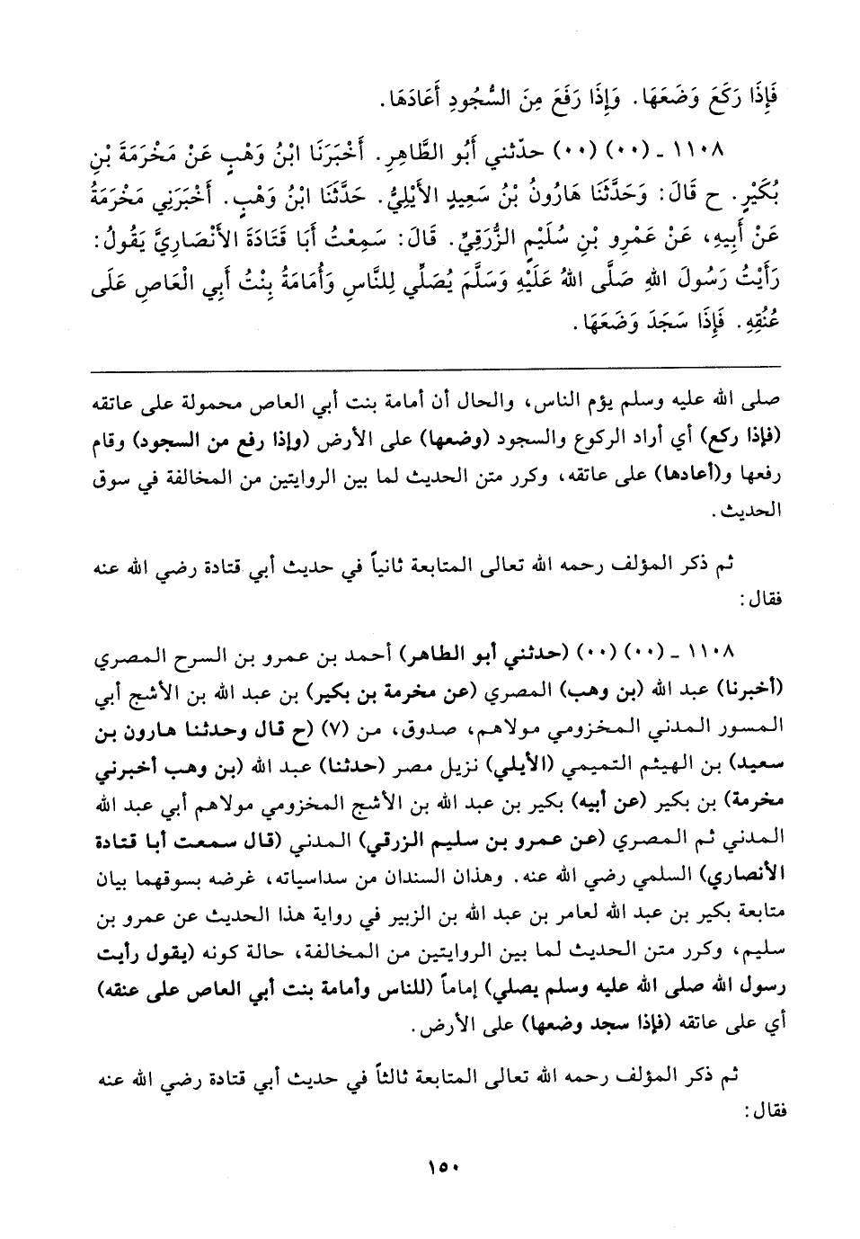 ١١٠٨ - (٠٠) (٠٠) حدثني أَبُو الطَّاهِرِ. أَخْبَرَنَا ابْنُ وَهْبٍ عَنْ مَخْرَمَةَ بْنِ بُكَيرِ. ح قَال: وَحَدثَنَا هَارُونُ بْنُ سَعِيدِ الأَيلِي. حَدَّثَنَا ابْنُ وَهْبٍ. أَخْبَرَنِي مَخْرَمَةُ عَنْ أَبِيهِ، عَنْ عَمْرِو بْنِ سُلَيمٍ الزُّرَقِيِّ. قَال: سَمِعْتُ أَبَا قَتَادَةَ الأنْصَارِيَّ يَقُولُ: رَأيتُ رَسُولَ اللهِ صَلَّى اللهُ عَلَيهِ وَسَلّمَ يُصَلِّي لِلنَاسِ وَأُمَامَةُ بِنْتُ أَبِي الْعَاصِ عَلَى عُنُقِهِ. فَإِذَا سَجَدَ وَضَعَهَا