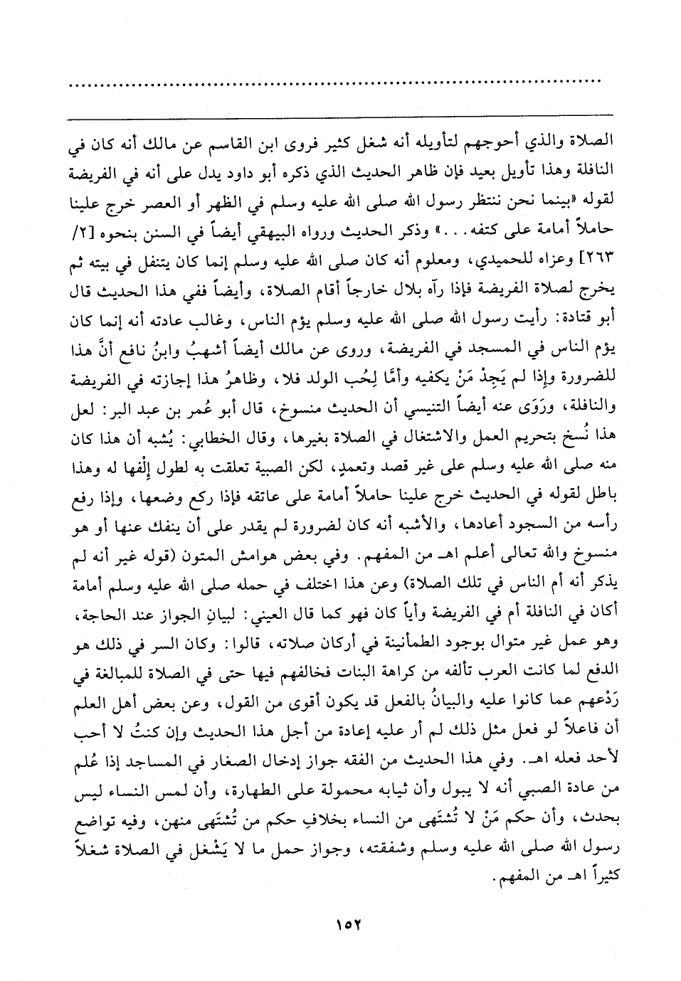 الصلاة والذي أحوجهم لتأويله أنه شغل كثير فروى ابن القاسم عن مالك أنه كان في النافلة وهذا تأويل بعيد فإن ظاهر الحديث الذي ذكره أبو داود يدل على أنه في الفريضة لقوله "بينما نحن ننتظر رسول الله صلى الله عليه وسلم في الظهر أو العصر خرج علينا حاملًا أمامة على كتفه ... " وذكر الحديث ورواه البيهقي أيضًا في السنن بنحوه [٢/ ٢٦٣] وعزاه للحميدي، ومعلوم أنه كان صلى الله عليه وسلم إنما كان يتنفل في بيته ثم يخرج لصلاة الفريضة فإذا رآه بلال خارجًا أقام الصلاة، وأيضًا ففي هذا الحديث قال أبو قتادة: رأيت رسول الله صلى الله عليه وسلم يؤم الناس، وغالب عادته أنه إنما كان يؤم الناس في المسجد في الفريضة، وروى عن مالك أيضًا أشهبُ وابنُ نافع أن هذا للضرورة وإِذا لم يَجِدْ مَنْ يكفيه وأمَّا لِحُب الولد فلا، وظاهرُ هذا إجازته في الفريضة والنافلة، ورَوَى عنه أيضًا التنيسي أن الحديث منسوخ، قال أبو عُمر بن عبد البر: لعل هذا نُسخ بتحريم الحمل والاشتغال في الصلاة بغيرها، وقال الخطابي: يُشبه أن هذا كان منه صلى الله عليه وسلم على غير قصد وتعمدٍ، لكن الصبية تعلقت به لطول إِلْفها له وهذا باطل لقوله في الحديث خرج علينا حاملًا أمامة على عاتقه فإذا ركع وضعها، وإذا رفع رأسه من السجود أعادها، والأشبه أنه كان لضرورة لم يقدر على أن ينفك عنها أو هو منسوخ والله تعالى أعلم اهـ من المفهم. وفي بعض هوامش المتون (قوله غير أنه لم يذكر أنه أم الناس في تلك الصلاة) وعن هذا اختلف في حمله صلى الله عليه وسلم أمامة أكان في النافلة أم في الفريضة وأيًا كان فهو كما قال العيني: لبيانِ الجواز عند الحاجة، وهو عمل غير متوال بوجود الطمأنينة في أركان صلاته، قالوا: وكان السر في ذلك هو الدفع لما كانت الحرب تألفه من كراهة البنات فخالفهم فيها حتى في الصلاة للمبالغة في رَدْعهم عما كانوا عليه والبيانُ بالفعل قد يكون أقوى من القول، وعن بعض أهل العلم أن فاعلًا لو فعل مثل ذلك لم أر عليه إعادة من أجل هذا الحديث وإن كنتُ لا أحب لأحد فعله اهـ. وفي هذا الحديث من الفقه جواز إدخال الصغار في المساجد إذا عُلم من عادة الصبي أنه لا يبول وأن ثيابه محمولة على الطهارة، وأن لمس النساء ليس بحدث، وأن حكم مَن لا تُشتَهى من النساء بخلافِ حكم من تُشتَهى منهن، وفيه تواضع رسول الله صلى الله عليه وسلم وشفقته، وجواز حمل ما لا يَشْغل في الصلاة شغلًا كثيرًا اهـ من المفهم.
