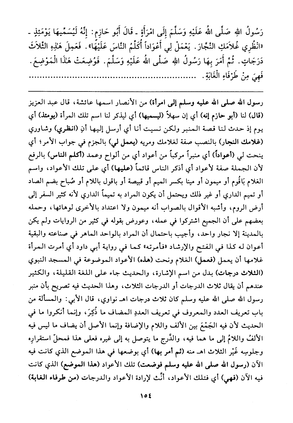 رَسُولُ الله صَلى الله عَلَيهِ وَسَلّمَ إِلَى امْرَأَةٍ -قَال أَبُو حَازِم: إِنهُ لَيُسَميهَا يَوْمَئِذٍ- "انْظُرِي غُلامَكِ النَّجَّارَ. يَعْمَلْ لِي أَعْوَادًا أُكَلِّمُ الناسَ عَلَيهَا". فَعَمِلَ هَذِهِ الثلاثَ دَرَجَاتٍ ثُم أَمَرَ بِهَا رَسُولُ الله صَلى الله عَلَيهِ وَسَلمَ. فَوُضِعَتْ هَذا الْمَوْضِعَ. فَهِيَ مِنْ طَرْفَاءِ الْغَابَةِ
