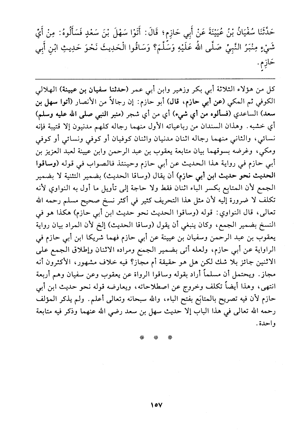 كل من هؤلاء الثلاثة أبي بكر وزهير وابن أبي عمر (حدثنا سفيان بن عيينة) الهلالي الكوفي ثم المكي (عن أبي حازم، قال) أبو حازم: إن رجالًا من الأنصار (أتوا سهل بن سعد) الساعدي (فسألوه من أي شيء) أي من أي شجر (منبر النبي صلى الله عليه وسلم) أي خشبه. وهذان السندان من رباعياته الأول منهما رجاله كلهم مدنيون إلا قتيبة فإنه نسائي، والثاني منهما رجاله اثنان مدنيان واثنان كوفيان أو كوفي ونسائي أو كوفي ومكي، وغرضه بسوقهما بيان متابعة يعقوب بن عبد الرحمن وابن عيينة لعبد العزيز بن أبي حازم في رواية هذا الحديث عن أبي حازم وحينئذ فالصواب في قوله (وساقوا الحديث نحو حديث ابن أبي حازم) أن يقال (وساقا الحديث) بضمير التثنية لا بضمير الجمع لأن المتابع بكسر الباء اثنان فقط ولا حاجة إلى تأويل ما أول به النواوي لأنه تكلف لا ضرورة إليه لأن مثل هذا التحريف كثير في أكثر نسخ صحيح مسلم رحمه الله تعالى، قال النواوي: قوله (وساقوا الحديث نحو حديث ابن أبي حازم) هكذا هو في النسخ بضمير الجمع، وكان ينبغي أن يقول (وساقا الحديث) إلخ لأن المراد بيان رواية يعقوب بن عبد الرحمن وسفيان بن عيينة عن أبي حازم فهما شريكا ابن أبي حازم في الراواية عن أبي حازم، ولعله أتى بضمير الجمع ومراده الاثنان وإطلاق الجمع على الاثنين جائز بلا شك لكن هل هو حقيقة أم مجاز؟ فيه خلاف مشهور، الأكثرون أنه مجاز. ويحتمل أن مسلمًا أراد بقوله وساقوا الرواة عن يعقوب وعن سفيان وهم أربعة انتهى، وهذا أيضًا تكلف وخروج عن اصطلاحاته، ويعارضه قوله نحو حديث ابن أبي حازم لأن فيه تصريح بالمتابَع بفتح الباء، والله سبحانه وتعالى أعلم. ولم يذكر المؤلف رحمه الله تعالى في هذا الباب إلا حديث سهل بن سعد رضي الله عنهما وذكر فيه متابعة واحدة.