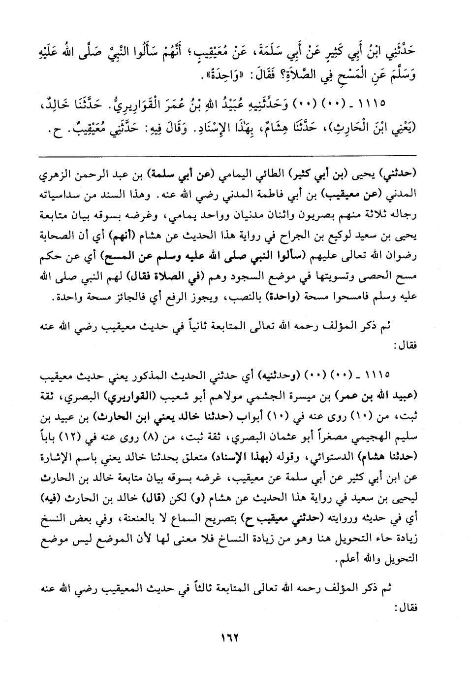 ١١١٥ - (٠٠) (٠٠) (وحدثنيه) أي حدثني الحديث المذكور يعني حديث معيقيب (عبيد الله بن عمر) بن ميسرة الجشمي مولاهم أبو شعيب (القواريري) البصري، ثقة ثبت، من (١٠) روى عنه في (١٠) أبواب (حدثنا خالد يعني ابن الحارث) بن عبيد بن سليم الهجيمي مصغرًا أبو عثمان البصري، ثقة ثبت، من (٨) روى عنه في (١٢) بابا (حدثنا هشام) الدستوائي، وقوله (بهذا الإسناد) متعلق بحدثنا خالد يعني باسم الإشارة عن ابن أبي كثير عن أبي سلمة عن معيقيب، غرضه بسوقه بيان متابعة خالد بن الحارث ليحيى بن سعيد في رواية هذا الحديث عن هشام (و) لكن (قال) خالد بن الحارث (فيه) أي في حديثه وروايته (حدثني معيقيب ح) بتصريح السماع لا بالعنعنة، وفي بعض النسخ زيادة حاء التحويل هنا وهو من زيادة النساخ فلا معنى لها لأن الموضع ليس موضع التحويل والله أعلم.