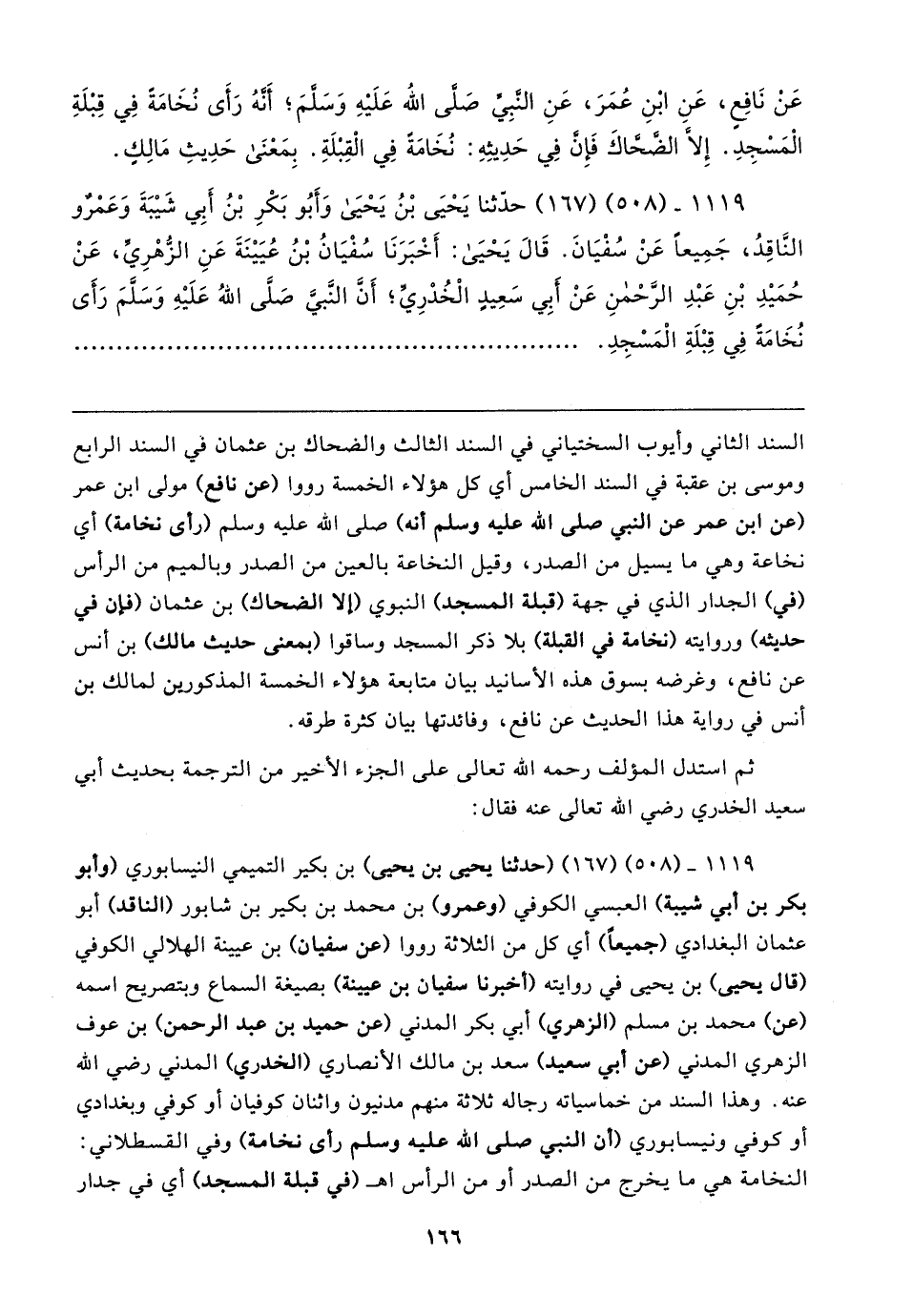 ١١١٩ - (٥٠٨) (١٦٧) (حدثنا يحيى بن يحيى) بن بكير التميمي النيسابوري (وأبو بكر بن أبي شيبة) العبسي الكوفي (وعمرو) بن محمد بن بكير بن شابور (الناقد) أبو عثمان البغدادي (جميعًا) أي كل من الثلاثة رووا (عن سفيان) بن عيينة الهلالي الكوفي (قال يحيى) بن يحيى في روايته (أخبرنا سفيان بن عيينة) بصيغة السماع وبتصريح اسمه (عن) محمد بن مسلم (الزهري) أبي بكر المدني (عن حميد بن عبد الرحمن) بن عوف الزهري المدني (عن أبي سعيد) سعد بن مالك الأنصاري (الخدري) المدني رضي الله عنه. وهذا السند من خماسياته رجاله ثلاثة منهم مدنيون واثنان كوفيان أو كوفي وبغدادي أو كوفي ونيسابوري (أن النبي صلى الله عليه وسلم رأى نخامة) وفي القسطلاني: النخامة هي ما يخرج من الصدر أو من الرأس اهـ (في قبلة المسجد) أي في جدار