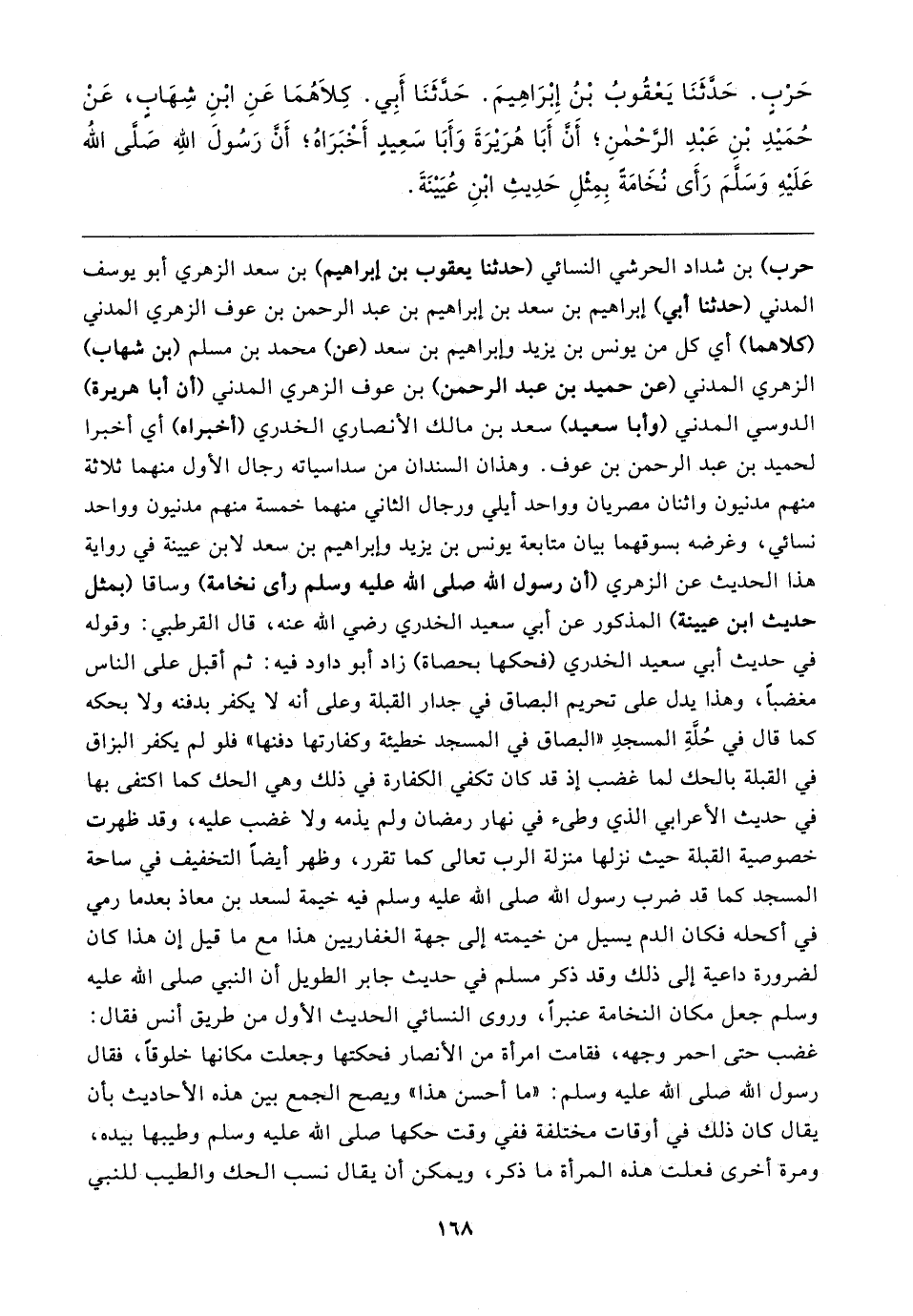 حَرْبٍ. حَدَّثَنَا يَعْقُوبُ بْنُ إِبْرَاهِيمَ. حَدَّثَنَا أَبِي. كِلاهُمَا عَنِ ابْنِ شِهَابٍ، عَنْ حُمَيدِ بْنِ عَبْدِ الرّحْمنِ؛ أَن أَبَا هُرَيرَةَ وَأَبَا سَعِيدٍ أَخْبَرَاهُ؛ أَن رَسُولَ الله صَلى الله عَلَيهِ وَسَلمَ رَأَى نُخَامَةَ بِمِثْلِ حَدِيثِ ابْنِ عُيَينَةَ