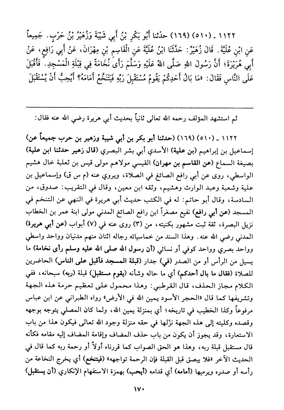 ١١٢٢ - (٥١٠) (١٦٩) حدثنا أَبُو بَكْرِ بْنُ أَبِي شَيبَةَ وَزُهَيرُ بْنُ حَرْبٍ. جَمِيعًا عَنِ ابْنِ عُلَيَّةَ. قَال زُهَيرٌ: حَدَّثنَا ابْنُ عُلَيَّةَ عَنِ الْقَاسِمِ بْنِ مِهْرَانَ، عَنْ أَبِي رَافِعٍ، عَنْ أَبِي هُرَيرَةَ؛ أَن رَسُولَ اللهِ صَلَّى اللهُ عَلَيهِ وَسَلَّمَ رَأى نُخَامَةَ فِي قِبْلَةِ الْمَسْجِدِ. فَأقْبَلَ عَلَى النَّاسِ فَقَال: "مَا بَالُ أَحَدِكُمْ يَقُومُ مُسْتَقْبِلَ رَبهِ فَيَتَنَخَّعُ أمَامَهُ؟ أَيُحِبُّ أَنْ يُسْتَقْبَلَ