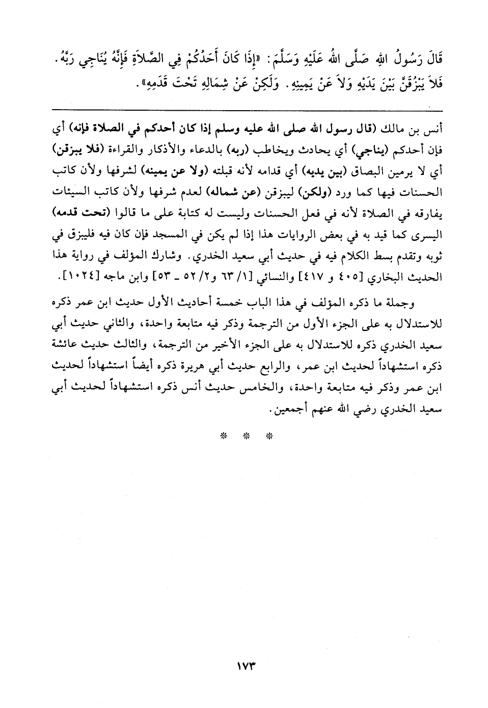 أنس بن مالك (قال رسول الله صلى الله عليه وسلم إذا كان أحدكم في الصلاة فإنه) أي فإن أحدكم (يناجي) أي يحادث ويخاطب (ربه) بالدعاء والأذكار والقراءة (فلا يبزقن) أي لا يرمين البصاق (بين يديه) أي قدامه لأنه قبلته (ولا عن يمينه) لشرفها ولأن كاتب الحسنات فيها كما ورد (ولكن) ليبزقن (عن شماله) لعدم شرفها ولأن كاتب السيئات يفارقه في الصلاة لأنه في فعل الحسنات وليست له كتابة على ما قالوا (تحت قدمه) اليسرى كما قيد به في بعض الروايات هذا إذا لم يكن في المسجد فإن كان فيه فليبزق في ثوبه وتقدم بسط الكلام فيه في حديث أبي سعيد الخدري. وشارك المؤلف في رواية هذا الحديث البخاري [٤٠٥ و ٤١٧] والنسائي [١/ ٦٣ و ٢/ ٥٢ - ٥٣] وابن ماجه [١٠٢٤].
