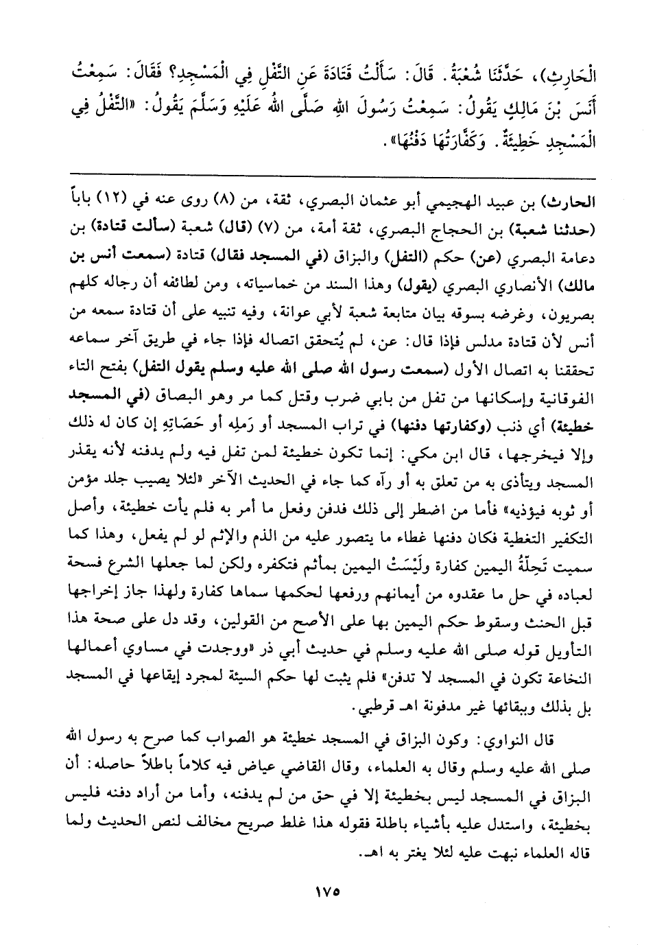 الْحَارِثِ)، حَدَّثَنَا شُعْبَةُ. قَال: سَأَلْتُ قَتَادَةَ عَنِ التَّفْلِ فِي الْمَسْجِدِ؟ فَقَال: سَمِعْتُ أَنَسَ بنَ مَالِكٍ يَقُولُ: سَمِعْتُ رَسُولَ الله صَلى الله عَلَيهِ وَسَلمَ يَقُولُ: "التفلُ فِي الْمَسْجِدِ خَطِيئَة. وَكَفَّارَتُهَا دَفْنُهَا"