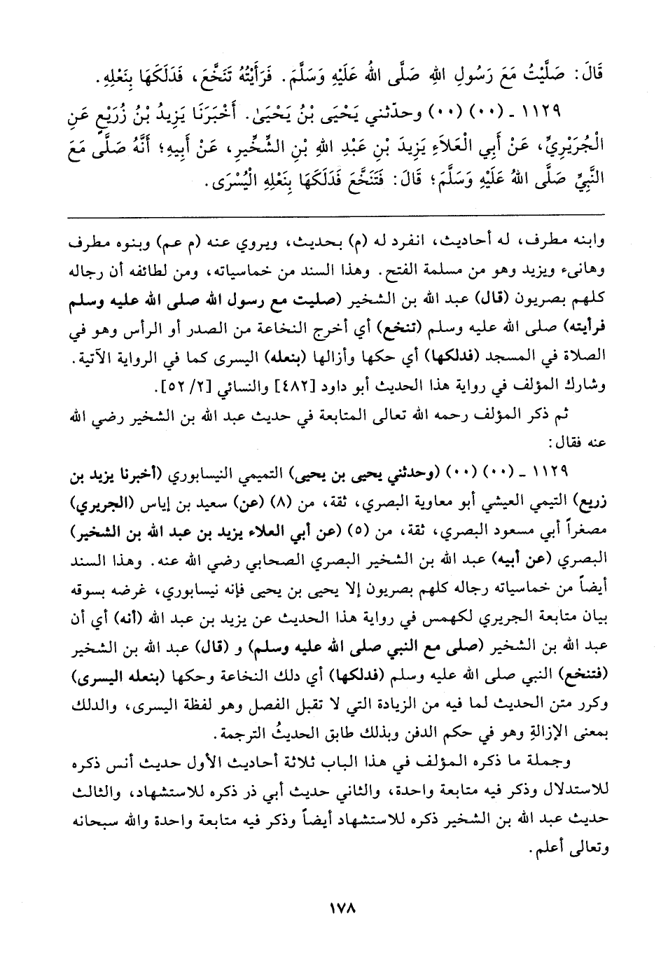 ١١٢٩ - (٠٠) (٠٠) وحدثني يَحْيَى بْنُ يَحْيَى. أَخْبَرَنَا يَزِيدُ بْنُ زُرَيعٍ عَنِ الْجُرَيرِي، عَنْ أبِي الْعَلاءِ يَزِيدَ بْنِ عَبْدِ اللهِ بْنِ الشخيرِ، عَنْ أَبِيهِ؛ أنَّهُ صَلَّى مَعَ النَّبِي صَلّى اللهُ عَلَيهِ وَسَلّمَ؛ قَال: فَتَنَخَّعَ فَدَلَكَهَا بِنَعْلِهِ الْيُسْرَى