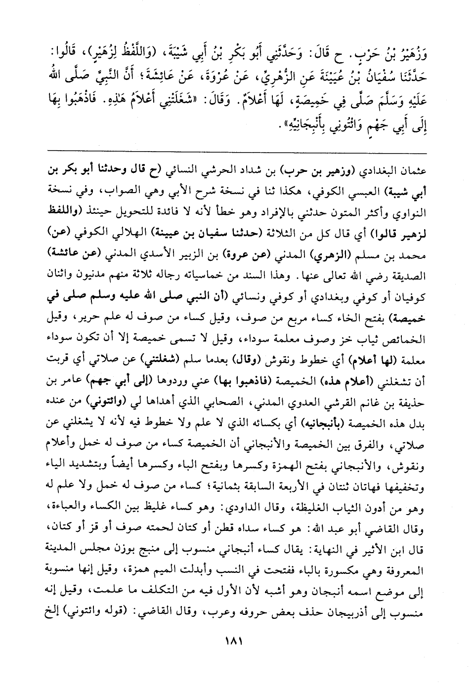 وَزُهَيرُ بْنُ حَرْبٍ. ح قَال: وَحَدَّثَنِي أَبُو بَكْرِ بْنُ أَبِي شَيبَةَ، (وَاللَّفْظُ لِزُهَيرٍ)، قَالُوا: حَدَّثَنَا سُفْيَانُ بْنُ عُيَينَةَ عَنِ الزُّهْرِيِّ، عَنْ عُرْوَةَ، عَنْ عَائِشَةَ؛ أَنَّ النَّبِيَّ صَلَّى الله عَلَيهِ وَسَلَّمَ صَلَّى فِي خَمِيصَةٍ، لَهَا أَعْلامٌ. وَقَال: "شَغَلَتْنِي أَعْلامُ هَذِهِ. فَاذْهَبُوا بِهَا إِلَى أَبِي جَهْمٍ وَائْتُونِي بِأَنْبِجَانِيِّهِ"