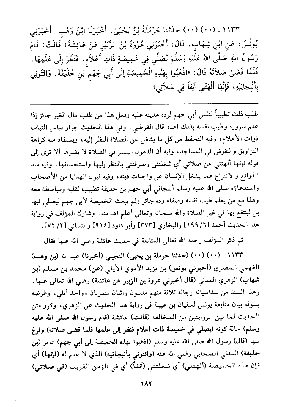 ١١٣٣ - (٠٠) (٠٠) حدثنا حَرْمَلَةُ بْنُ يَحْيَى. أَخْبَرَنَا ابْنُ وَهْبٍ. أَخْبَرَنِي يُونُسُ، عَنِ ابْنِ شِهَابٍ. قَال: أخْبَرَنِي عُرْوَةُ بْنُ الزُّبَيرِ عَنْ عَائِشَةَ؛ قَالتْ: قَامَ رَسُولُ اللهِ صَلَّى اللهُ عَلَيهِ وَسَلَّمَ يُصَلِّي فِي خَمِيصَةِ ذَاتِ أَعْلامٍ. فَنَظَرَ إِلَى عَلَمِهَا. فَلَمَّا قَضَى صَلاتَهُ قَال: "اذْهَبُوا بِهَذِهِ الْخَمِيصَةِ إِلَى أَبِي جَهْمٍ بْنِ حُذَيفَةَ. وَائْتُونِي بِأَنْبِجَانِيِّهِ، فَإِنَّهَا أَلْهَتْنِي آنِفًا فِي صَلاتِي"