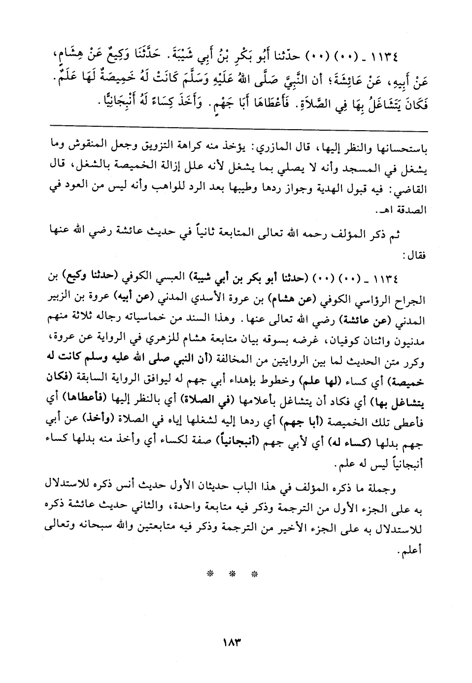 ١١٣٤ - (٠٠) (٠٠) حدثنا أَبُو بَكْرِ بْنُ أَبِي شَيبَةَ. حَدَّثَنَا وَكِيعٌ عَنْ هِشَامٍ، عَنْ أَبِيهِ، عَنْ عَائِشَةَ؛ أن النَّبِيَّ صَلَّى اللهُ عَلَيهِ وَسَلَّمَ كَانَتْ لَهُ خَمِيصَةٌ لَهَا عَلَمٌ. فَكَانَ يَتَشَاغَلُ بِهَا فِي الصَّلاةِ. فَأَعْطَاهَا أَبَا جَهْمٍ. وَأَخَذَ كِسَاءً لَهُ أَنْبِجَانِيًّا