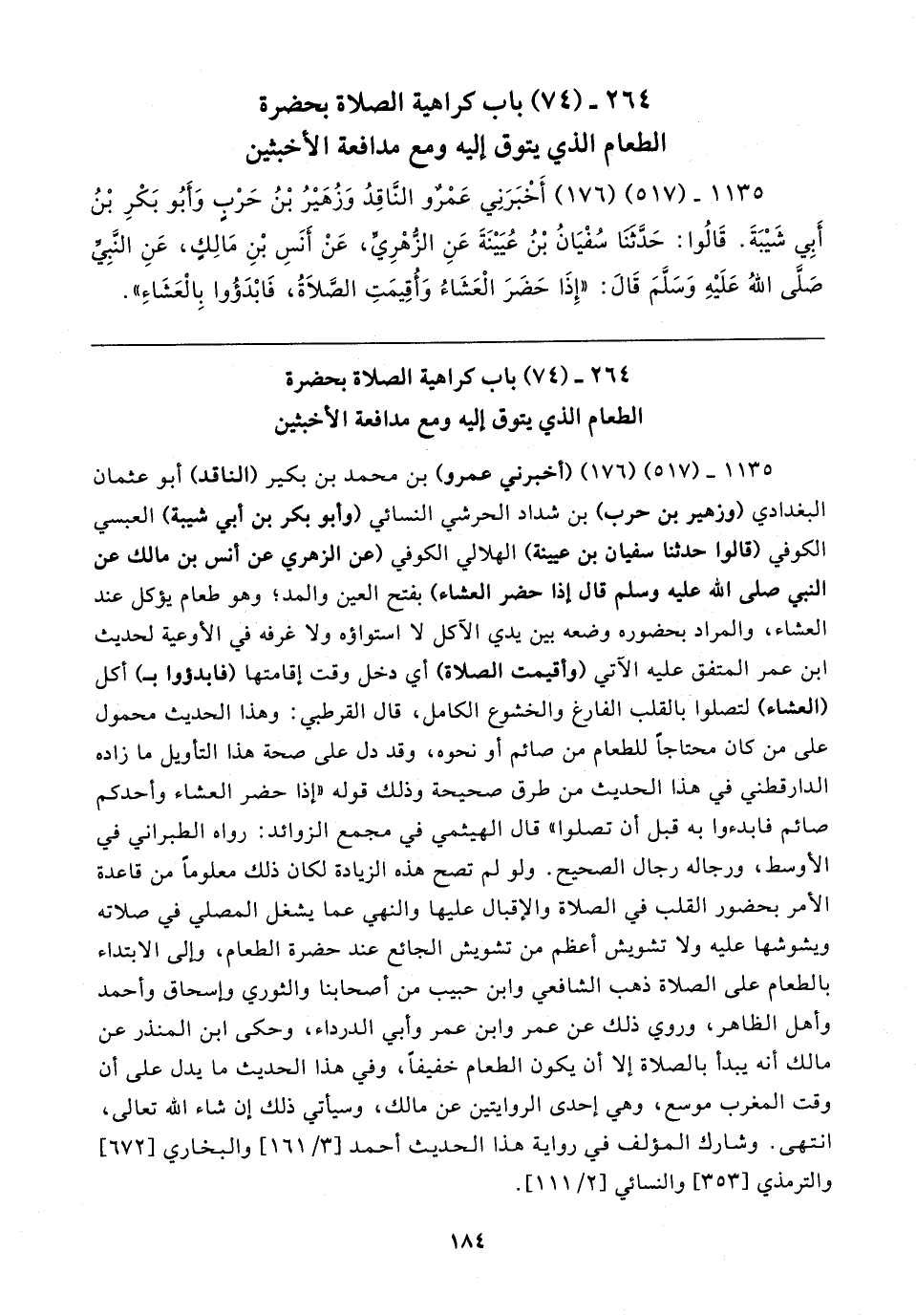 ١١٣٥ - (٥١٧) (١٧٦) أَخْبَرَنِي عَمْرٌو النَّاقِدُ وَزُهَيرُ بْنُ حَرْبٍ وَأَبُو بَكْرِ بْنُ أَبِي شَيبَةَ. قَالُوا: حَدَّثَنَا سُفْيَانُ بْنُ عُيَينَةَ عَنِ الزُّهْرِيِّ، عَنْ أَنَسِ بْنِ مَالِكٍ، عَنِ النَّبِيِّ صَلَّى اللهُ عَلَيهِ وَسَلَّمَ قَال: "إِذَا حَضَرَ الْعَشَاءُ وَأُقِيمَتِ الصَّلاةُ، فَابْدَؤُوا بِالْعَشَاءِ"