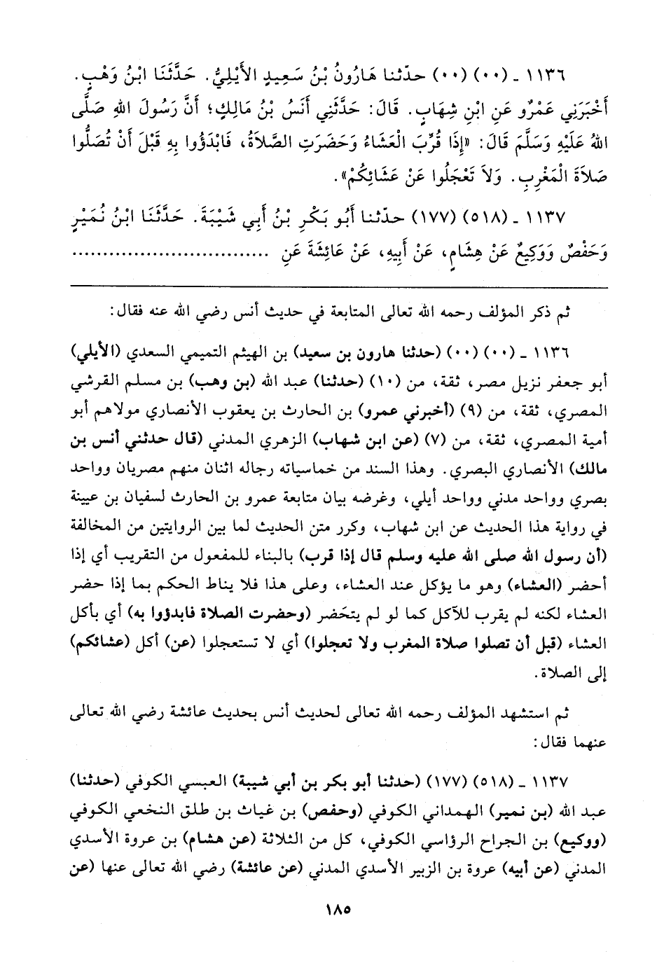 ١١٣٦ - (٠٠) (٠٠) (حدثنا هارون بن سعيد) بن الهيثم التميمي السعدي (الأيلي) أبو جعفر نزيل مصر، ثقة، من (١٠) (حدثنا) عبد الله (بن وهب) بن مسلم القرشي المصري، ثقة، من (٩) (أخبرني عمرو) بن الحارث بن يعقوب الأنصاري مولاهم أبو أمية المصري، ثقة، من (٧) (عن ابن شهاب) الزهري المدني (قال حدثني أنس بن مالك) الأنصاري البصري. وهذا السند من خماسياته رجاله اثنان منهم مصريان وواحد بصري وواحد مدني وواحد أيلي، وغرضه بيان متابعة عمرو بن الحارث لسفيان بن عيينة في رواية هذا الحديث عن ابن شهاب، وكرر متن الحديث لما بين الروايتين من المخالفة (أن رسول الله صلى الله عليه وسلم قال إذا قرب) بالبناء للمفعول من التقريب أي إذا أحضر (العشاء) وهو ما يؤكل عند العشاء، وعلى هذا فلا يناط الحكم بما إذا حضر العشاء لكنه لم يقرب للآكل كما لو لم يتحَضر (وحضرت الصلاة فابدؤوا به) أي بأكل العشاء (قبل أن تصلوا صلاة المغرب ولا تعجلوا) أي لا تستعجلوا (عن) أكل (عشائكم) إلى الصلاة.