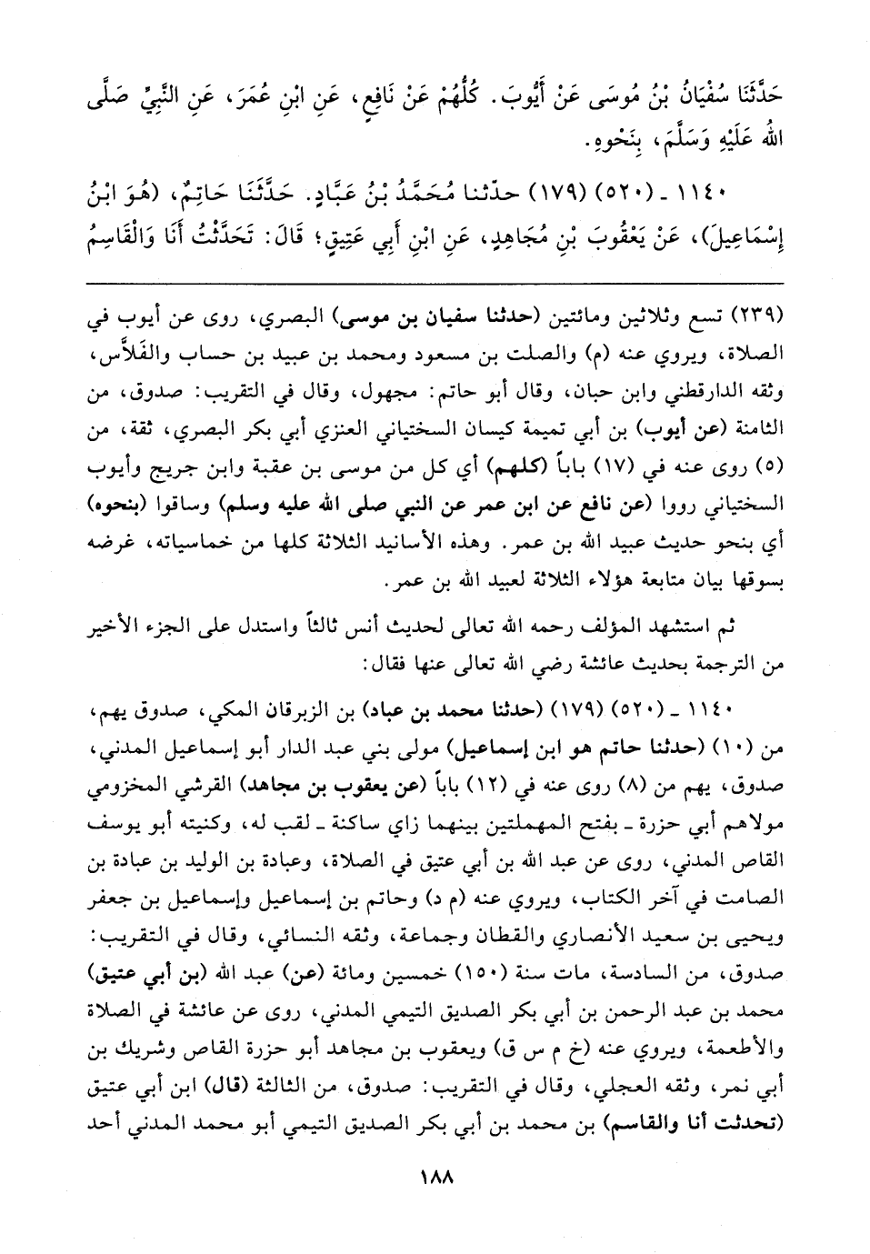 ١١٤٠ - (٥٢٠) (١٧٩) (حدثنا محمد بن عباد) بن الزبرقان المكي، صدوق يهم، من (١٠) (حدثنا حاتم هو ابن إسماعيل) مولى بني عبد الدار أبو إسماعيل المدني، صدوق، يهم من (٨) روى عنه في (١٢) بابا (عن يعقوب بن مجاهد) القرشي المخزومي مولاهم أبي حزرة -بفتح المهملتين بينهما زاي ساكنة- لقب له، وكنيته أبو يوسف القاص المدني، روى عن عبد الله بن أبي عتيق في الصلاة، وعبادة بن الوليد بن عبادة بن الصامت في آخر الكتاب، ويروي عنه (م د) وحاتم بن إسماعيل وإسماعيل بن جعفر ويحيى بن سعيد الأنصاري والقطان وجماعة، وثقه النسائي، وقال في التقريب: صدوق، من السادسة، مات سنة (١٥٠) خمسين ومائة (عن) عبد الله (بن أبي عتيق) محمد بن عبد الرحمن بن أبي بكر الصديق التيمي المدني، روى عن عائشة في الصلاة والأطعمة، ويروي عنه (خ م س ق) ويعقوب بن مجاهد أبو حزرة القاص وشريك بن أبي تمر، وثقه العجلي، وقال في التقريب: صدوق، من الثالثة (قال) ابن أبي عتيق (تحدثت أنا والقاسم) بن محمد بن أبي بكر الصديق التيمي أبو محمد المدني أحد