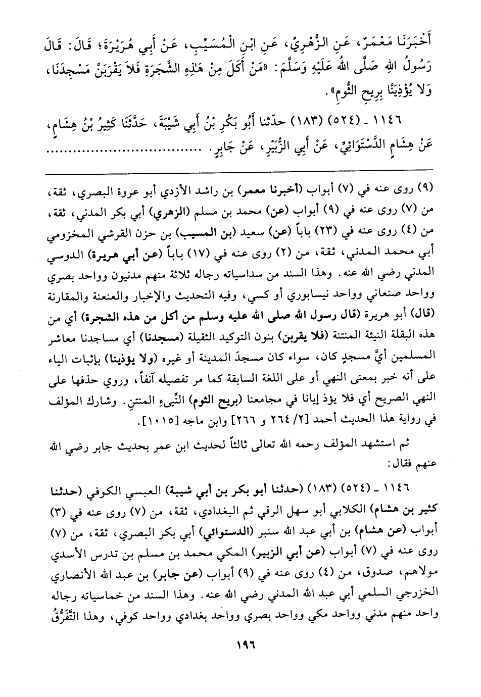 ١١٤٦ - (٥٢٤) (١٨٣) (حدثنا أبو بكر بن أبي شيبة) العبسي الكوفي (حدثنا كثير بن هشام) الكلابي أبو سهل الرقي ثم البغدادي، ثقة، من (٧) روى عنه في (٣) أبواب (عن هشام) بن أبي عبد الله سنبر (الدستوائي) أبي بكر البصري، ثقة، من (٧) روى عنه في (٧) أبواب (عن أبي الزبير) المكي محمد بن مسلم بن تدرس الأسدي مولاهم، صدوق، من (٤) روى عنه في (٩) أبواب (عن جابر) بن عبد الله الأنصاري الخزرجي السلمي أبي عبد الله المدني رضي الله عنه. وهذا السند من خماسياته رجاله واحد منهم مدني وواحد مكي وواحد بصري وواخد بغدادي وواحد كوفي، وهذا التَّفَرُّقُ