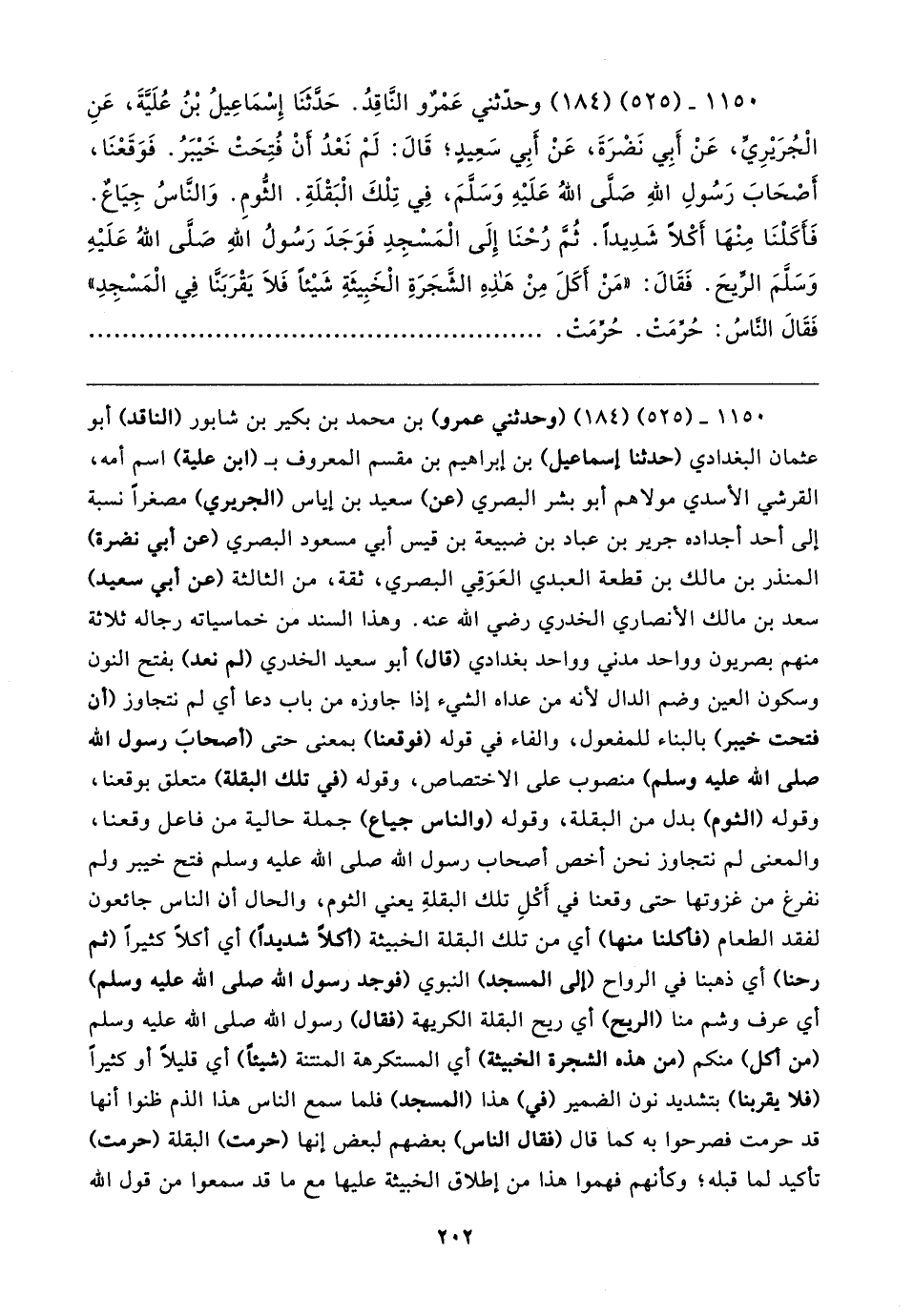 ١١٥٠ - (٥٢٥) (١٨٤) وحدّثني عَمْرٌو النَّاقِدُ. حَدَّثنَا إِسْمَاعِيلُ بْنُ عُلَيَّةَ، عَنِ الْجُرَيرِيِّ، عَنْ أَبِي نَضْرَةَ، عَنْ أَبِي سَعِيدٍ؛ قَال: لَمْ نَعْدُ أنْ فُتِحَتْ خَيبَرُ. فَوَقَعْنَا، أَصْحَابَ رَسُولِ اللهِ صَلَّى اللهُ عَلَيهِ وَسَلَّمَ، فِي تِلْكَ الْبَقْلَةِ. الثُّومِ. وَالنَّاسُ جِيَاعٌ. فَأَكَلْنَا مِنْهَا أَكْلًا شَدِيدًا. ثُمَّ رُحْنَا إِلَى الْمَسْجِدِ فَوَجَدَ رَسُولُ اللهِ صَلَّى اللهُ عَلَيهِ وَسَلَّمَ الرِّيحَ. فَقَال: "مَنْ أَكَلَ مِنْ هَذِهِ الشَّجَرَةِ الْخَبِيثَةِ شَيئًا فَلَا يَقْرَبَنَّا فِي الْمَسْجِدِ" فَقَال النَّاسُ: حُرِّمَتْ. حُرِّمَت