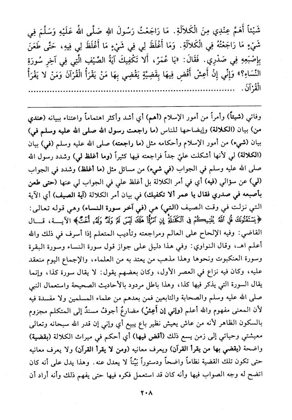 شَيئًا أَهَمَّ عِنْدِي مِنَ الكَلالةِ. مَا رَاجَعْتُ رَسُولَ الله صَلَّى الله عَلَيهِ وَسَلَّمَ فِي شَيءٍ مَا رَاجَعْتُهُ فِي الْكَلالةِ. وَمَا أَغلَظَ لِي فِي شَيءٍ مَا أَغْلَظَ لِي فِيهِ، حَتَّى طَعَنَ بِإِصْبَعِهِ فِي صَدْرِي. فَقَال: "يَا عُمَرُ، أَلا تَكْفِيكَ آيَةُ الضَّيفِ الَّتِي فِي آخِرِ سُورَةِ النِّسَاءِ؟ " وَإِنِّي إِنْ أَعِشْ أَقْضِ فِيهَا بِقَضِيَّةٍ يَقضِي بِهَا مَنْ يَقْرَأُ الْقُرْآنَ وَمَنْ لا يَقرَأُ الْقُرْآنَ