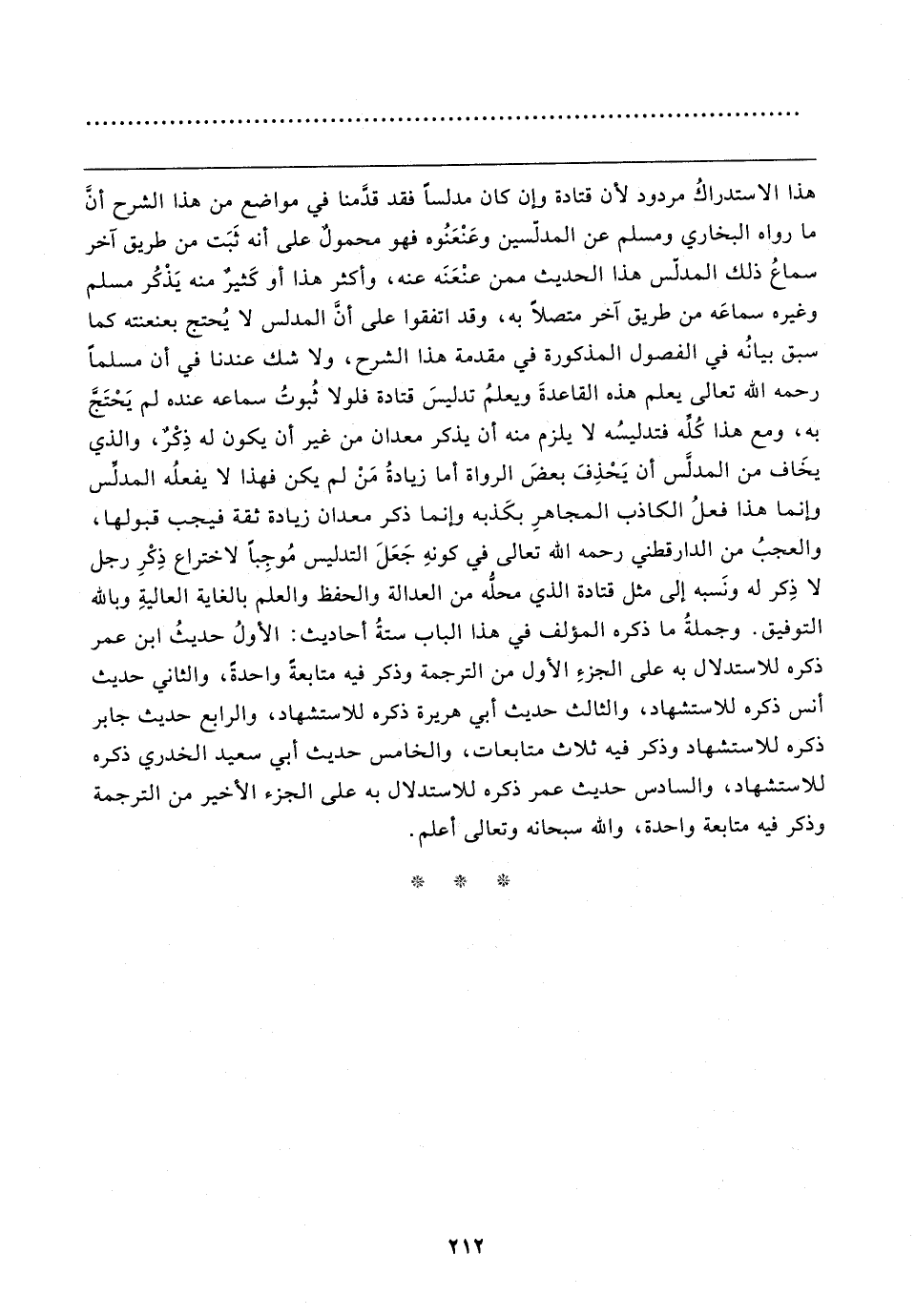 هذا الاستدراكُ مردود لأن قتادة وإن كان مدلسًا فقد قدَّمنا في مواضع من هذا الشرح أن ما رواه البخاري ومسلم عن المدلّسين وعَنْعَنُوه فهو محمولٌ على أنه ثَبَت من طريق آخر سماعُ ذلك المدلّس هذا الحديث ممن عنْعَنَه عنه، وأكثر هذا أو كَثيرٌ منه يَذْكُر مسلم وغيره سماعَه من طريق آخر متصلًا به، وقد اتفقوا على أن المدلس لا يُحتج بعنعنته كما سبق بيانُه في الفصول المذكورة في مقدمة هذا الشرح، ولا شك عندنا في أن مسلمًا رحمه الله تعالى يعلم هذه القاعدةَ ويعلمُ تدليسَ قتادة فلولا ثُبوتُ سماعه عنده لم يَحْتَجَّ به، ومع هذا كُلِّه فتدليسُه لا يلزم منه أن يذكر معدان من غير أن يكون له ذِكْرٌ، والذي يخَاف من المدلس أن يَحْذِفَ بعضَ الرواة أما زيادةُ مَنْ لم يكن فهذا لا يفعلُه المدني وإنما هذا فعلُ الكاذب المجاهرِ بكَذبه وإنما ذكر معدان زيادة ثقة فيجب قبولها، والعجبُ من الدارقطني رحمه الله تعالى في كونهِ جَعَلَ التدليس مُوجِبًا لاختراع ذِكْرِ رجل لا ذِكر له ونَسبه إلى مثل قتادة الذي محلُّه من العدالة والحفظ والعلم بالغاية العاليةِ وبالله التوفيق. وجملةُ ما ذكره المؤلف في هذا الباب ستةُ أحاديث: الأولُ حديثُ ابن عمر ذكره للاستدلال به على الجزءِ الأول من الترجمة وذكر فيه متابعةً واحدةً، والثاني حديث أنس ذكره للاستشهاد، والثالث حديث أبي هريرة ذكره للاستشهاد، والرابع حديث جابر ذكره للاستشهاد وذكر فيه ثلاث متابعات، والخامس حديث أبي سعيد الخدري ذكره للاستشهاد، والسادس حديث عمر ذكره للاستدلال به على الجزء الأخير من الترجمة وذكر فيه متابعة واحدة، والله سبحانه وتعالى أعلم.