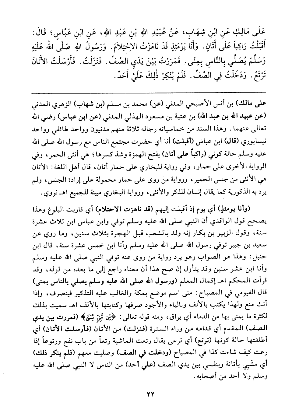 عَلَى مَالِكٍ عَنِ ابْنِ شِهَابٍ، عَنْ عُبَيدِ الله بْنِ عَبْدِ الله، عَنِ ابْنِ عَبَّاسٍ؛ قَال: أَقْبَلْتُ رَاكِبًا عَلَى أَتَانٍ. وَأَنَا يَوْمَئِذٍ قَدْ نَاهَزْتُ الاحْتِلامَ. وَرَسُولُ الله صَلَّى الله عَلَيهِ وَسَلَّمَ يُصَلِّي بِالنَّاسِ بِمِنًى. فَمَرَرْتُ بَينَ يَدَيِ الصَّفّ. فَنَزَلْتُ. فَأَرْسَلْتُ الأتَانَ تَرْتَعُ. وَدَخَلْتُ فِي الصَّفِّ. فَلَمْ يُنْكِرْ ذلِكَ عَلَى أَحَدٌ