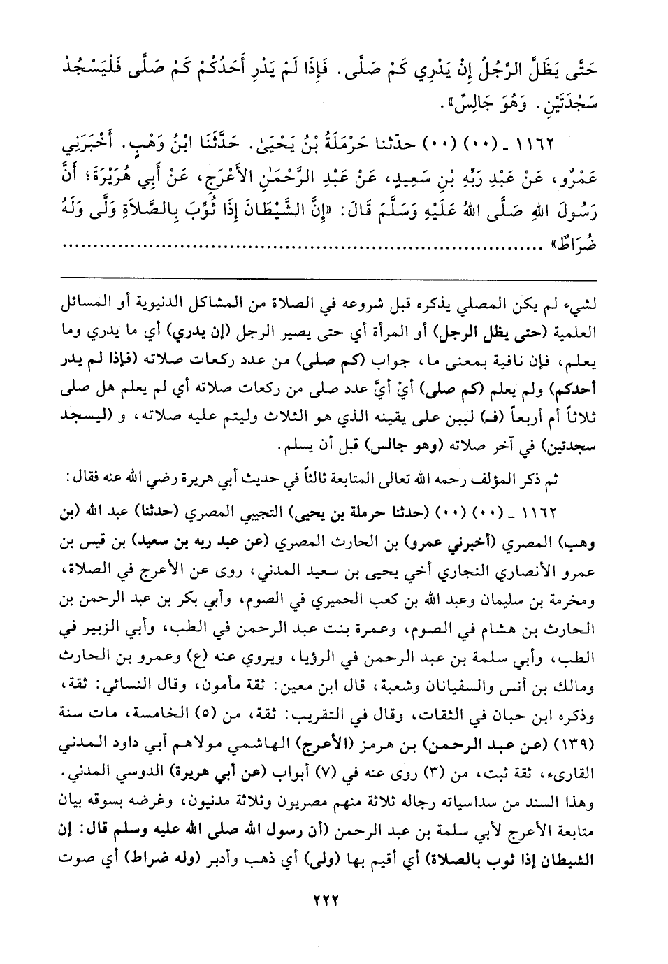 ١١٦٢ - (٠٠) (٠٠) (حدثنا حرملة بن يحيى) التجيبي المصري (حدثنا) عبد الله (بن وهب) المصري (أخبرني عمرو) بن الحارث المصري (عن عبد ربه بن سعيد) بن قيس بن عمرو الأنصاري النجاري أخي يحيى بن سعيد المدني، روى عن الأعرج في الصلاة، ومخرمة بن سليمان وعبد الله بن كعب الحميري في الصوم، وأبي بكر بن عبد الرحمن بن الحارث بن هشام في الصوم، وعمرة بنت عبد الرحمن في الطب، وأبي الزبير في الطب، وأبي سلمة بن عبد الرحمن في الرؤيا، ويروي عنه (ع) وعمرو بن الحارث ومالك بن أنس والسفيانان وشعبة، قال ابن معين: ثقة مأمون، وقال النسائي: ثقة، وذكره ابن حبان في الثقات، وقال في التقريب: ثقة، من (٥) الخامسة، مات سنة (١٣٩) (عن عبد الرحمن) بن هرمز (الأعرج) الهاشمي مولاهم أبي داود المدني القارئ، ثقة ثبت، من (٣) روى عنه في (٧) أبواب (عن أبي هريرة) الدوسي المدني. وهذا السند من سداسياته رجاله ثلاثة منهم مصريون وثلاثة مدنيون، وغرضه بسوقه بيان متابعة الأعرج لأبي سلمة بن عبد الرحمن (أن رسول الله صلى الله عليه وسلم قال: إن الشيطان إذا ثوب بالصلاة) أي أقيم بها (ولى) أي ذهب وأدبر (وله ضراط) أي صوت
