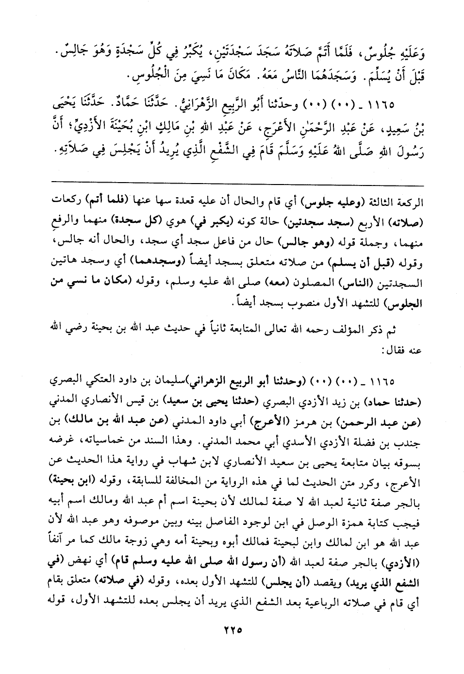 ١١٦٥ - (٠٠) (٠٠) (وحدثنا أبو الربيع الزهراني) سليمان بن داود العتكي البصري (حدثنا حماد) بن زيد الأزدي البصري (حدثنا يحيى بن سعيد) بن قيس الأنصاري المدني (عن عبد الرحمن) بن هرمز (الأعرج) أبي داود المدني (عن عبد الله بن مالك) بن جندب بن فضلة الأزدي الأسدي أبي محمد المدني. وهذا السند من خماسياته، غرضه بسوقه بيان متابعة يحيى بن سعيد الأنصاري لابن شهاب في رواية هذا الحديث عن الأعرج، وكرر متن الحديث لما في هذه الرواية من المخالفة للسابقة، وقوله (ابن بحينة) بالجر صفة ثانية لعبد الله لا صفة لمالك لأن بحينة اسم أم عبد الله ومالك اسم أبيه فيجب كتابة همزة الوصل في ابن لوجود الفاصل بينه وبين موصوفه وهو عبد الله لأن عبد الله هو ابن لمالك وابن لبحينة فمالك أبوه وبحينة أمه وهي زوجة مالك كما مر آنفًا (الأزدي) بالجر صفة لعبد الله (أن رسول الله صلى الله عليه وسلم قام) أي نهض (في الشفع الذي يريد) ويقصد (أن يجلس) للتشهد الأول بعده، وقوله (في صلاته) متعلق بقام أي قام في صلاته الرباعية بعد الشفع الذي يريد أن يجلس بعده للتشهد الأول، قوله