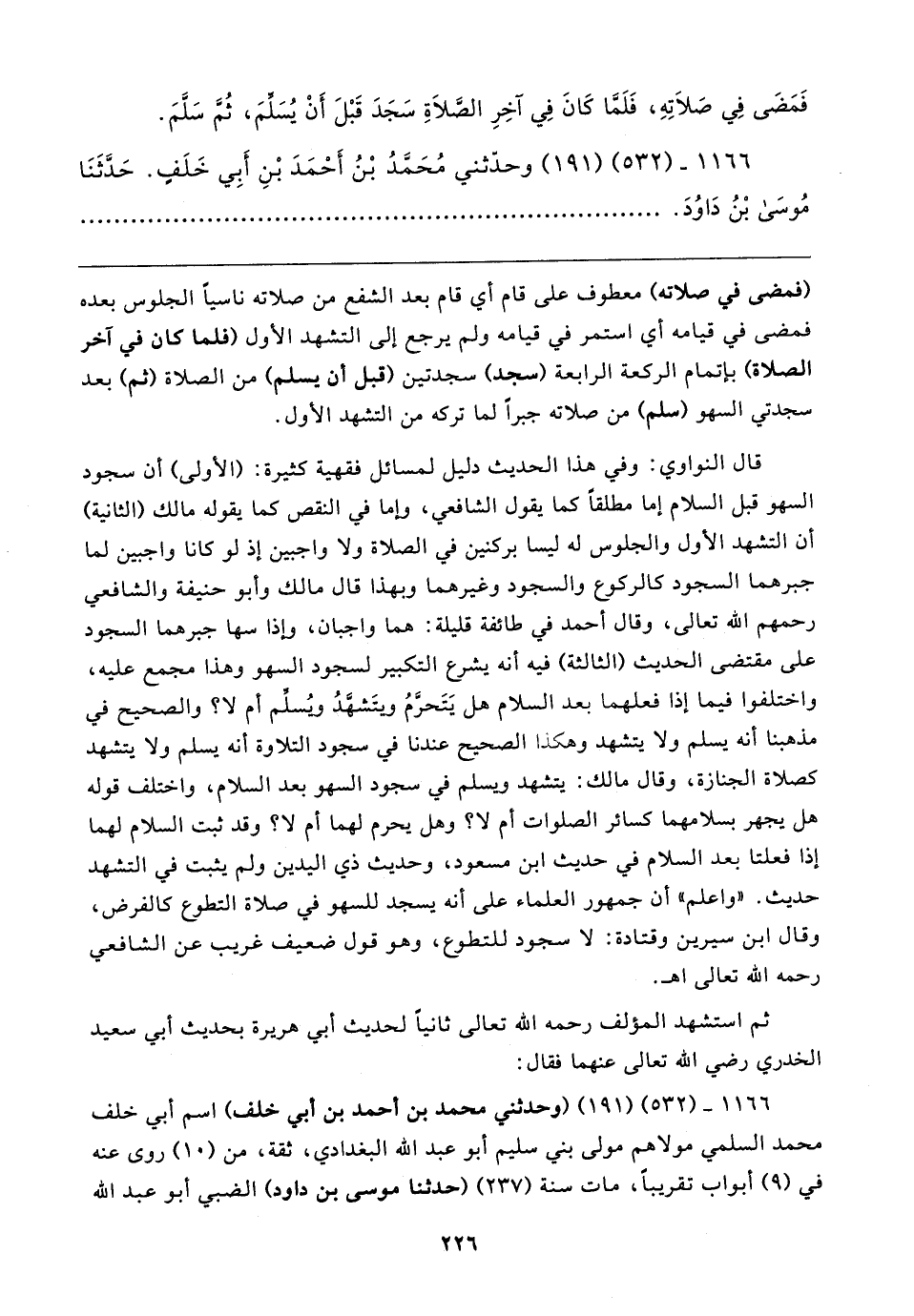قال النواوي: وفي هذا الحديث دليل لمسائل فقهية كثيرة: (الأولى) أن سجود السهو قبل السلام إما مطلقًا كما يقول الشافعي، وإما في النقص كما يقوله مالك (الثانية) أن التشهد الأول والجلوس له ليسا بركنين في الصلاة ولا واجبين إذ لو كانا واجبين لما جبرهما السجود كالركوع والسجود وغيرهما وبهذا قال مالك وأبو حنيفة والشافعي رحمهم الله تعالى، وقال أحمد في طائفة قليلة: هما واجبان، وإذا سها جبرهما السجود على مقتضى الحديث (الثالثة) فيه أنه يشرع التكبير لسجود السهو وهذا مجمع عليه، واختلفوا فيما إذا فعلهما بعد السلام هل يَتَحرَّمُ ويتَشهَّدُ ويُسلِّم أم لا؟ والصحيح في مذهبنا أنه يسلم ولا يتشهد وهكذا الصحيح عندنا في سجود التلاوة أنه يسلم ولا يتشهد كصلاة الجنازة، وقال مالك: يتشهد ويسلم في سجود السهو بعد السلام، واختلف قوله هل يجهر بسلامهما كسائر الصلوات أم لا؟ وهل يحرم لهما أم لا؟ وقد ثبت السلام لهما إذا فعلتا بعد السلام في حديث ابن مسعود، وحديث ذي اليدين ولم يثبت في التشهد حديث. "واعلم" أن جمهور العلماء على أنه يسجد للسهو في صلاة التطوع كالفرض، وقال ابن سيرين وقتادة: لا سجود للتطوع، وهو قول ضعيف غريب عن الشافعي رحمه الله تعالى اهـ.