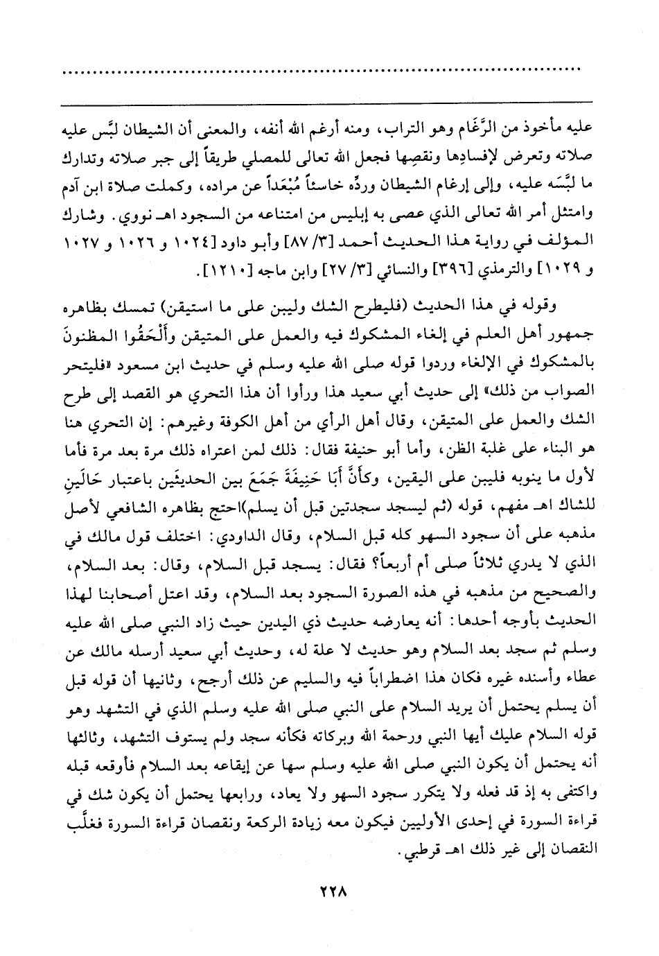 وقوله في هذا الحديث (فليطرح الشك وليبن علي ما استيقن) تمسك بظاهره جمهور أهل العلم في إلغاء المشكوك فيه والعمل على المتيقن وأَلْحَقُوا المظنونَ بالمشكوك في الإلغاء وردوا قوله صلى الله عليه وسلم في حديث ابن مسعود "فليتحر الصواب من ذلك، إلى حديث أبي سعيد هذا ورأوا أن هذا التحري هو القصد إلى طرح الشك والعمل على المتيقن، وقال أهل الرأي من أهل الكوفة وغيرهم: إن التحري هنا هو البناء على غلبة الظن، وأما أبو حنيفة فقال: ذلك لمن اعتراه ذلك مرة بعد مرة فأما لأول ما ينوبه فليبن علي اليقين، وكأَنَّ أَبَا حَنِيفَةَ جَمَعَ بين الحديثَين باعتبار حَالينِ للشاك اهـ مفهم، قوله (ثم ليسجد سجدتين قبل أن يسلم) احتج بظاهره الشافعي لأصل مذهبه على أن سجود السهو كله قبل السلام، وقال الداودي: اختلف قول مالك في الذي لا يدري ثلاثًا صلى أم أربعًا؟ فقال: يسجد قبل السلام، وقال: بعد السلام، والصحيح من مذهبه في هذه الصورة السجود بعد السلام، وقد اعتل أصحابنا لهذا الحديث بأوجه أحدها: أنه يعارضه حديث ذي اليدين حيث زاد النبي صلى الله عليه وسلم ثم سجد بعد السلام وهو حديث لا علة له، وحديث أبي سعيد أرسله مالك عن عطاء وأسنده غيره فكان هذا اضطرابًا فيه والسليم عن ذلك أرجح، وثانيها أن قوله قبل أن يسلم يحتمل أن يريد السلام على النبي صلى الله عليه وسلم الذي في التشهد وهو قوله السلام عليك أيها النبي ورحمة الله وبركاته فإنه سجد ولم يستوف التشهد، وثالثها أنه يحتمل أن يكون النبي صلى الله عليه وسلم سها عن إيقاعه بعد السلام فأوقعه قبله واكتفى به إذ قد فعله ولا يتكرر سجود السهو ولا يعاد، ورابعها يحتمل أن يكون شك في قراءة السورة في إحدى الأوليين فيكون معه زيادة الركعة ونقصان قراءة السورة فغلَّب النقصان إلى غير ذلك اهـ قرطبي.