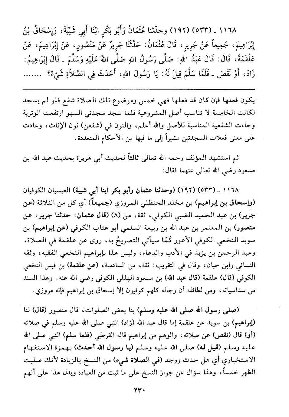 ١١٦٨ - (٥٣٣) (١٩٢) وحدثنا عُثْمَانُ وَأَبُو بَكْرِ ابْنَا أَبِي شَيبَةَ، وَإِسْحَاقُ بْنُ إِبْرَاهِيمَ، جَمِيعًا عَنْ جَرِيرٍ، قَال عُثْمَانُ: حَدَّثَنَا جَرِيرٌ عَنْ مَنْصُورٍ، عَنْ إِبْرَاهِيمَ، عَنْ عَلقَمَةَ، قَال: قَال عَبْدُ اللهِ: صَلى رَسُولُ اللهِ صَلَّى اللهُ عَلَيهِ وسلَمَ- قَال إِبْرَاهِيمُ: زَادَ، أَوْ نَقَصَ- فَلَمَّا سَلّمَ قِيلَ لَهُ: يَا رَسُولَ اللهِ، أَحَدَثَ في الصَّلاةِ شَيءٌ؟