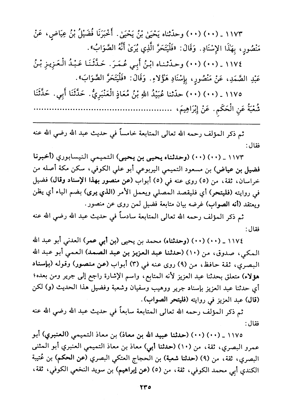 ١١٧٤ - (٠٠) (٠٠) (وحدثناه) محمَّد بن يحيى (بن أبي عمر) العدني أبو عبد الله المكيّ، صدوق، من (١٠) (حَدَّثَنَا عبد العزيز بن عبد الصمد) العمي أبو عبد الله البَصْرِيّ، ثِقَة حافظ، من (٩) روى عنه في (٣) أبواب (عن منصور) وقوله (بإسناد هؤلاء) متعلق بحدثنا عبد العزيز لأنه المتابع، واسم الإشارة راجع إلى جرير ومن بعده؛ أي حَدَّثَنَا عبد العزيز بإسناد جرير ووهيب وسفيان وشعبة وفضيل هذا الحديث (و) لكن (قال) عبد العزيز في روايته (فليتحر الصواب).