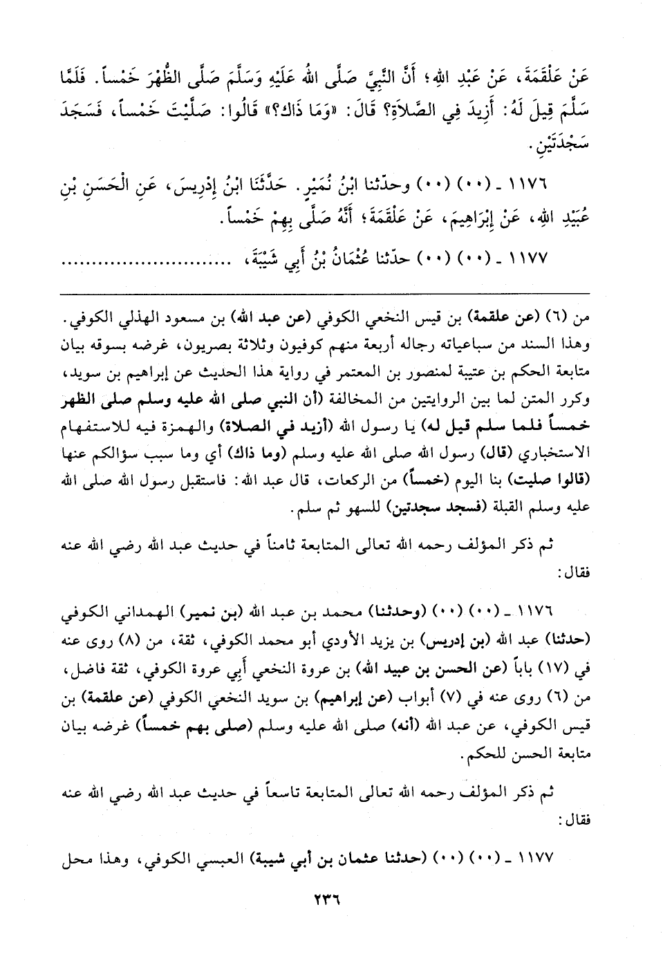 ١١٧٦ - (٠٠) (٠٠) (وحدثنا) محمَّد بن عبد الله (بن نمير) الهمداني الكُوفيّ (حدثنا) عبد الله (بن إدريس) بن يزيد الأودي أبو محمَّد الكُوفيّ، ثِقَة، من (٨) روى عنه في (١٧) بابا (عن الحسن بن عبيد الله) بن عروة النَّخَعيّ أَبِي عروة الكُوفيّ، ثِقَة فاضل، من (٦) روى عنه في (٧) أبواب (عن إبراهيم) بن سويد النَّخَعيّ الكُوفيّ (عن علقمة) بن قيس الكُوفيّ، عن عبد الله (أنَّه) صلى الله عليه وسلم (صلى بهم خمسًا) غرضه بيان متابعة الحسن للحكم.