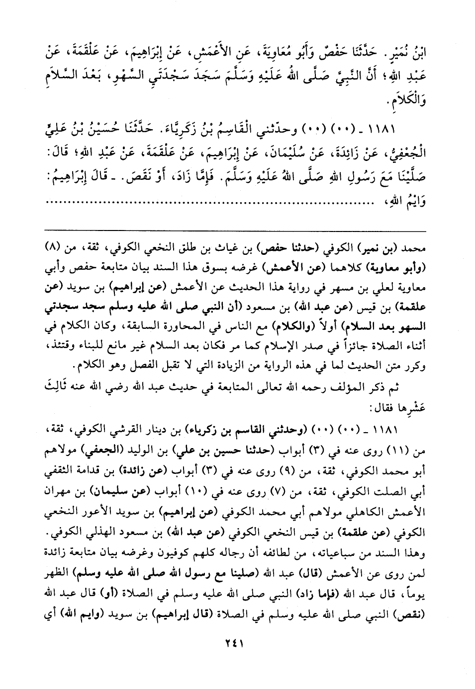 ابْنُ نُمَيرٍ. حَدَّثَنَا حَفصٌ وَأَبُو مُعَاوَيةَ، عَنِ الأَعمَشِ، عَنْ إِبْرَاهِيمَ، عَنْ عَلقَمَةَ، عَنْ عَبْدِ الله؛ أن النَّبِيّ صلى الله عَلَيهِ وَسلمَ سَجَدَ سَجْدَتَيِ السَّهْو، بَعْدَ الكلامِ وَالكَلامِ.