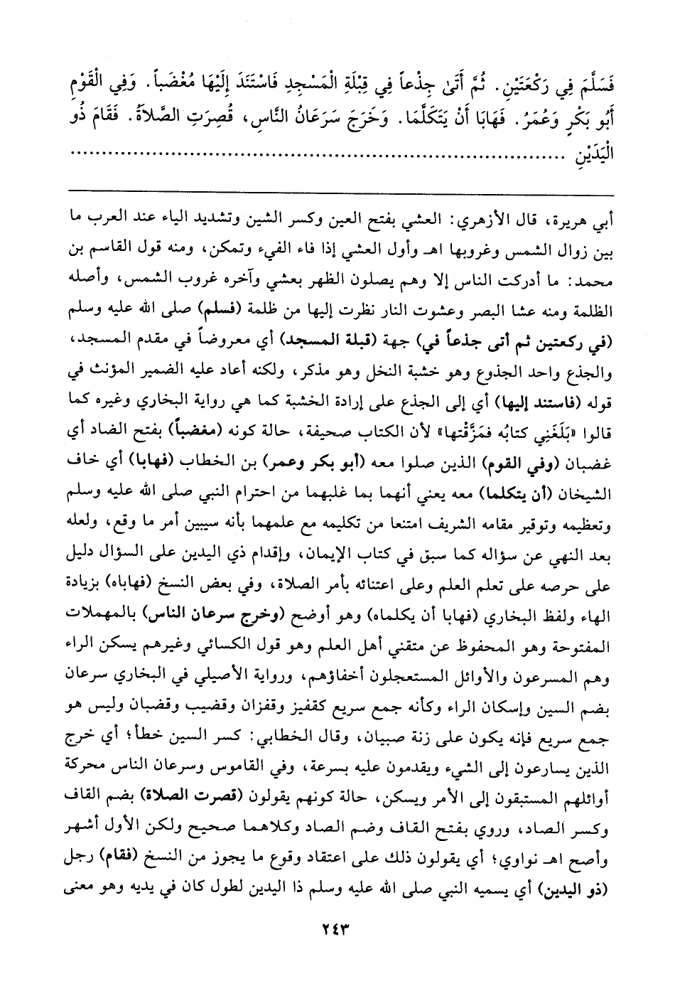 فسلَّمَ في رَكْعَتَينِ. ثُمَّ أَتَى جِذْعًا في قِبْلَةِ المَسْجِدِ فَاسْتَنَدَ إِلَيهَا مُغْضَبًا. وَفِي القَوْمِ أَبُو بَكرٍ وَعُمَرُ. فَهَابَا أَنْ يَتَكَلمَا. وَخَرَجَ سَرَعَانُ الناسِ، قُصِرَتِ الصلاة. فَقَامَ ذُو اليَدَينِ