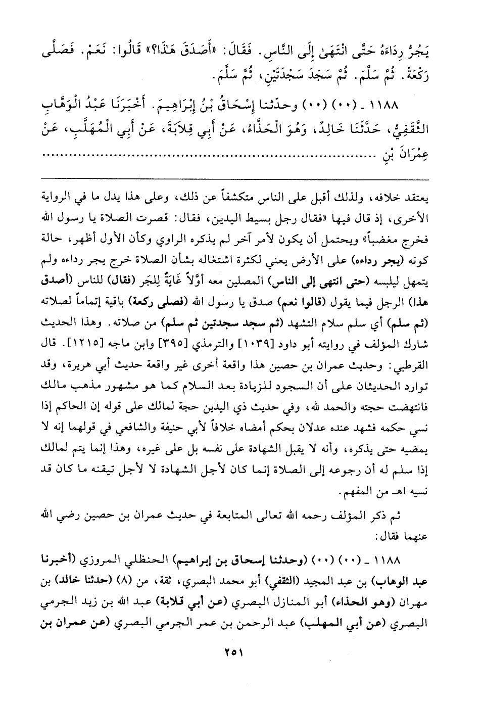 ١١٨٨ - (٠٠) (٠٠) (وحدثنا إسحاق بن إبراهيم) الحنظلي المروزي (أخبرنا عبد الوهَّاب) بن عبد المجيد (الثَّقَفيّ) أبو محمَّد البَصْرِيّ، ثِقَة، من (٨) (حَدَّثَنَا خالد) بن مهران (وهو الحذَّاء) أبو المنازل البَصْرِيّ (عن أبي قلابة) عبد الله بن زيد الجرمي البَصْرِيّ (عن أبي المهلب) عبد الرَّحْمَن بن عمر الجرمي البَصْرِيّ (عن عمران بن