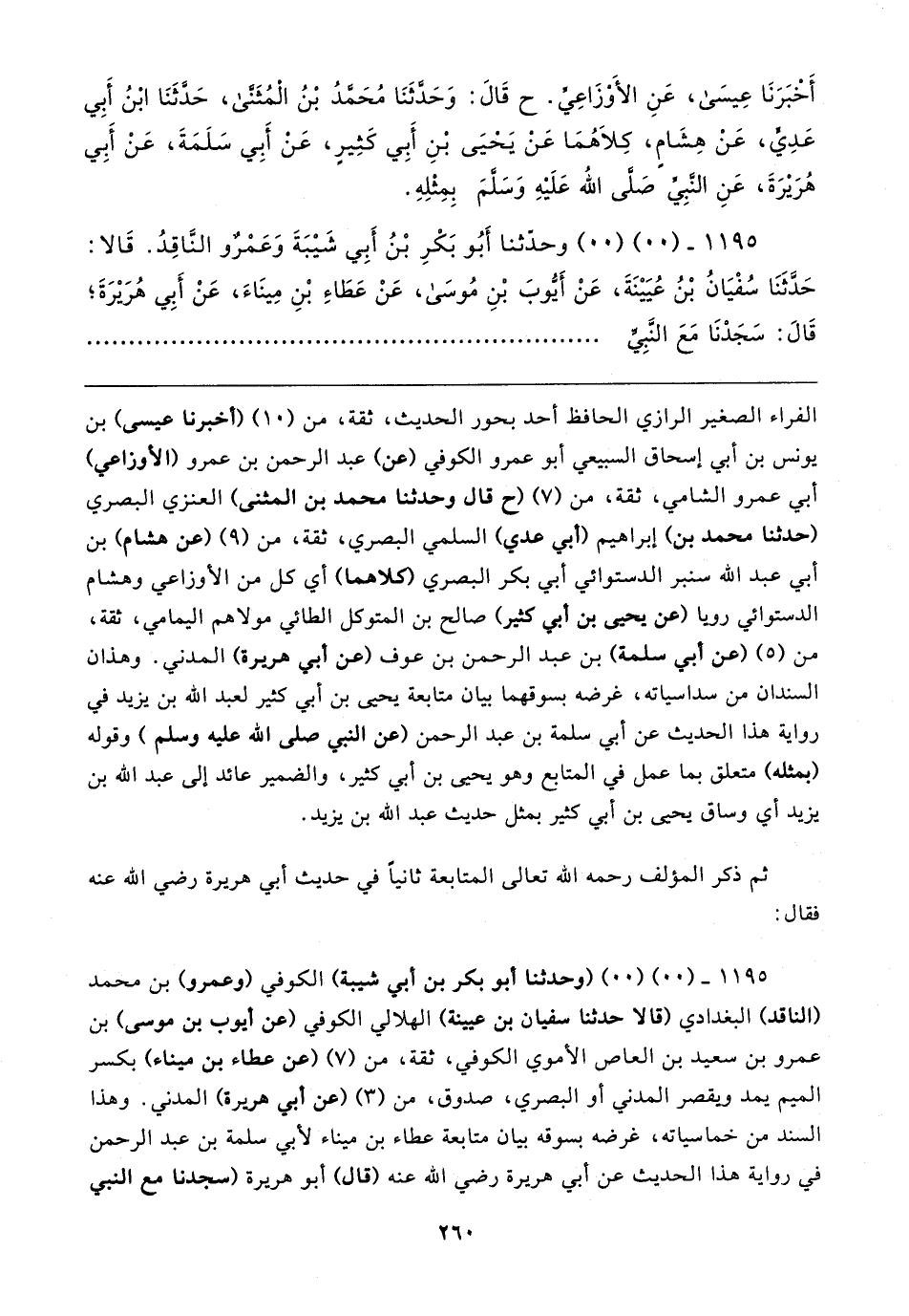 ١١٩٥ - (٠٠) (٠٠) (وحدثنا أبو بكر بن أبي شيبة) الكُوفيّ (وعمرو) بن محمَّد (النَّاقد) البغدادي (قالا حَدَّثَنَا سفيان بن عيينة) الهلالي الكُوفيّ (عن أَيُّوب بن موسى) بن عمرو بن سعيد بن العاص الأُموي الكُوفيّ، ثِقَة، من (٧) (عن عطاء بن ميناء) بكسر الميم يمد ويقصر المدنِيُّ أو البَصْرِيّ، صدوق، من (٣) (عن أبي هريرة) المدنِيُّ. وهذا السند من خماسياته، غرضه بسوقه بيان متابعة عطاء بن ميناء لأبي سلمة بن عبد الرَّحْمَن في رواية هذا الحديث عن أبي هريرة رضي الله عنه (قال) أبو هريرة (سجدنا مع النَّبِيّ