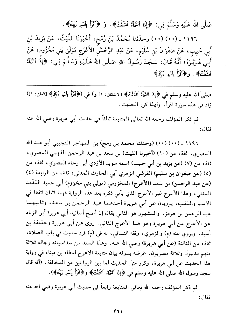 ١١٩٦ - (٠٠) (٠٠) (وحدثنا محمَّد بن رمح) بن المهاجر التجيبي أبو عبد الله المصري، ثِقَة، من (١٠) (أخبرنا الليث) بن سعد بن عبد الرَّحْمَن الفهمي المصري، ثِقَة، من (٧) (عن يزيد بن أبي حبيب) اسمه سويد الأَزدِيّ أبي رجاء المصري، ثِقَة، من (٥) (عن صفوان بن سليم) القُرشيّ الزُّهْرِيّ أبي الحارث المدنِيُّ، ثِقَة، من الرابعة (٤) (عن عبد الرَّحْمَن) بن سعد (الأعرج) المخزومي (مولى بني مخزوم) أبي حميد المُقْعد المدنِيُّ، وهذا الأعرج غير الأعرج الذي يأتي ذكره بعد هذه الرواية فهما اثنان اتفقا في الاسم واللقب، يرويان عن أبي هريرة أحدهما عبد الرَّحْمَن بن سعد، وثانيهما عبد الرَّحْمَن بن هرمز، والمشهور هو الثاني يقال إن أصح أسانيد أبي هريرة أبو الزِّناد عن الأعرج عن أبي هريرة وهو هذا الأعرج الثاني. روى عن أبي هريرة وحذيفة بن أسيد، ويروي عنه (م) والزهري، وثقه النَّسائيّ، له في (م) فرد حديث في باب الصلاة، ثِقَة، من الثالثة (عن أبي هريرة) رضي الله عنه. وهذا السند من سداسياته رجاله ثلاثة منهم مدنيون وثلاثة مصريون، غرضه بسوقه بيان متابعة الأعرج لعطاء بن ميناء في رواية هذا الحديث عن أبي هريرة، وكرر متن الحديث لما بين الروايتين من المخالفة. (أنه قال سجد رسول الله صلى الله عليه وسلم في {إِذَا السَّمَاءُ انْشَقَّتْ (١)} [الانشقاق: ١] {اقْرَأْ بِاسْمِ رَبِّكَ الَّذِي خَلَقَ (١)} [العلق: ١].