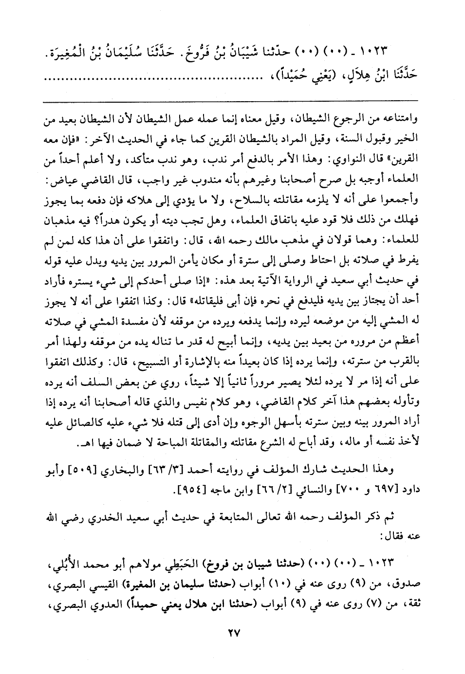 وامتناعه من الرجوع الشيطان، وقيل معناه إنما عمله عمل الشيطان لأن الشيطان بعيد من الخير وقبول السنة، وقيل المراد بالشيطان القرين كما جاء في الحديث الآخر: "فإن معه القرين" قال النواوي: وهذا الأمر بالدفع أمر ندب، وهو ندب متأكد، ولا أعلم أحدًا من العلماء أوجبه بل صرح أصحابنا وغيرهم بأنه مندوب غير واجب، قال القاضي عياض: وأجمعوا على أنه لا يلزمه مقاتلته بالسلاح، ولا ما يؤدي إلى هلاكه فإن دفعه بما يجوز فهلك من ذلك فلا قود عليه باتفاق العلماء، وهل تجب ديته أو يكون هدرًا؟ فيه مذهبان للعلماء: وهما قولان في مذهب مالك رحمه الله، قال: واتفقوا على أن هذا كله لمن لم يفرط في صلاته بل احتاط وصلى إلى سترة أو مكان يأمن المرور بين يديه ويدل عليه قوله في حديث أبي سعيد في الرواية الآتية بعد هذه: "إذا صلى أحدكم إلى شيء يستره فأراد أحد أن يجتاز بين يديه فليدفع في نحره فإن أبى فليقاتله" قال: وكذا اتفقوا على أنه لا يجوز له المشي إليه من موضعه ليرده وإنما يدفعه ويرده من موقفه لأن مفسدة المشي في صلاته أعظم من مروره من بعيد بين يديه، وإنما أبيح له قدر ما تناله يده من موقفه ولهذا أمر بالقرب من سترته، وإنما يرده إذا كان بعيدًا منه بالإشارة أو التسبيح، قال: وكذلك اتفقوا على أنه إذا مر لا يرده لئلا يصير مرورًا ثانيًا إلا شيئًا، روي عن بعض السلف أنه يرده وتأوله بعضهم هذا آخر كلام القاضي، وهو كلام نفيس والذي قاله أصحابنا أنه يرده إذا أراد المرور بينه وبين سترته بأسهل الوجوه وإن أدى إلى قتله فلا شيء عليه كالصائل عليه لأخذ نفسه أو ماله، وقد أباح له الشرع مقاتلته والمقاتلة المباحة لا ضمان فيها اهـ.