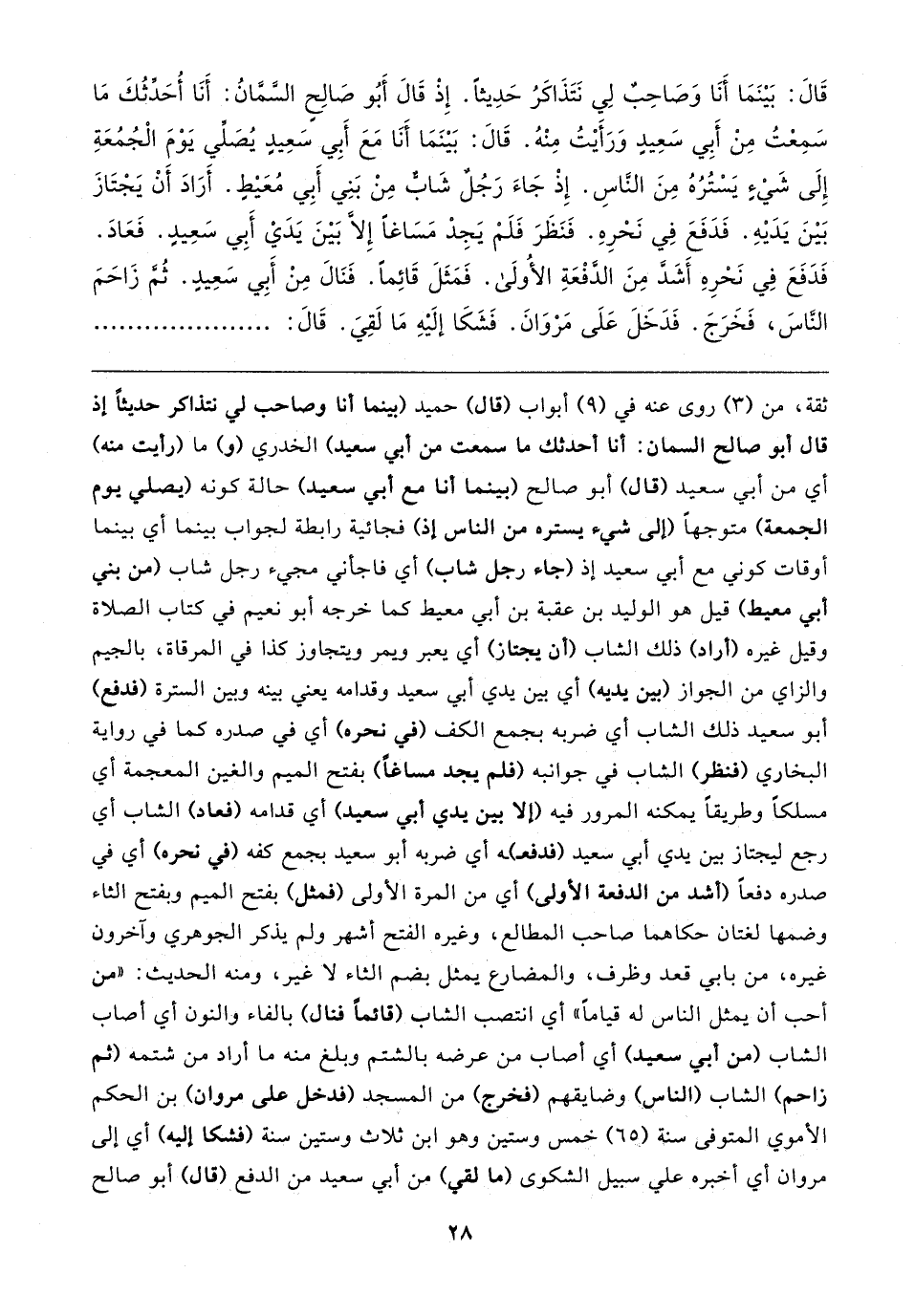قَال: بَيْنَمَا أَنَا وَصَاحِبٌ لِي نَتَذَاكَرُ حَدِيثًا. إِذْ قَال أَبُو صَالِحٍ السَّمَّانُ: أَنَا أُحَدِّثُكَ مَا سَمِعْتُ مِنْ أَبِي سَعِيدِ وَرَأَيتُ مِنْهُ. قَال: بَينَمَا أَنَا مَعَ أَبِي سَعِيدٍ يُصَلِّي يَوْمَ الْجُمُعَةِ إِلَى شَيءٍ يَسْتُرُهُ مِنَ النَّاسِ. إِذْ جَاءَ رَجُلٌ شَابٌّ مِنْ بَنِي أَبِي مُعَيطٍ. أَرَادَ أَنْ يَجْتَازَ بَينَ يَدَيهِ. فَدَفَعَ فِي نَحْرِهِ. فَنَظَرَ فَلَمْ يَجِدْ مَسَاغًا إلا بَينَ يَدَي أَبِي سَعِيدٍ. فَعَادَ. فَدَفَعَ فِي نَحْرِهِ أَشَدَّ مِنَ الدَّفْعَةِ الأُولَى. فَمَثَلَ قَائِمًا. فَنَال مِنْ أَبِي سَعِيدٍ. ثُمَّ زَاحَمَ النَّاسَ، فَخَرَجَ. فَدَخَلَ عَلَى مَرْوَانَ. فَشَكَا إلَيهِ مَا لَقِيَ. قَال: