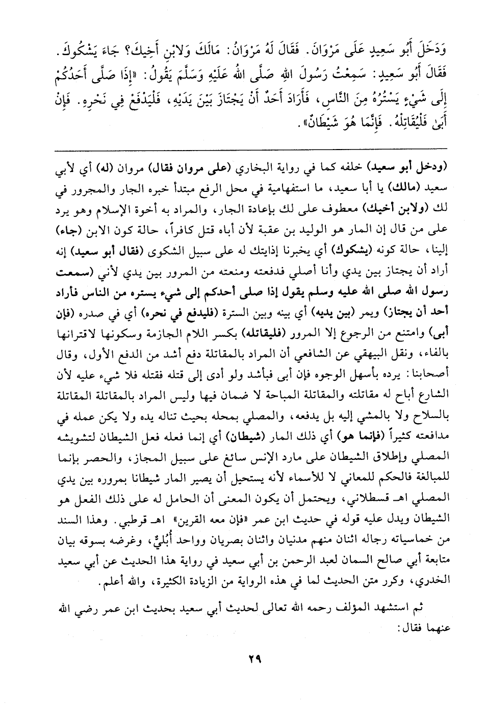 وَدَخَلَ أَبُو سَعِيدٍ عَلَى مَرْوَانَ. فَقَال لَهُ مَرْوَانُ: مَا لَكَ وَلابْنِ أَخِيكَ؟ جَاءَ يَشْكُوكَ. فَقَال أَبُو سَعِيدٍ: سَمِعْتُ رَسُولَ الله صَلَّى اللهُ عَلَيهِ وَسَلَّمَ يَقُولُ: "إِذَا صَلَّى أَحَدُكُمْ إِلَى شَيءٍ يَسْتُرُهُ مِنَ النَّاسِ، فَأَرَادَ أَحَدٌ أَنْ يَجْتَازَ بَينَ يَدَيهِ، فَلْيَدْفَعْ فِي نَحْرِهِ. فَإِنْ أَبَى فَلْيُقَاتِلْهُ. فَإِنَّمَا هُوَ شَيطَانٌ"