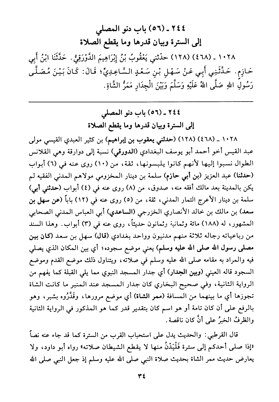١٠٢٨ - (٤٦٨) (١٢٨) (حدثني يعقوب بن إبراهيم) بن كثير العبدي القيسي مولى عبد القيس أخو أحمد أبو يوسف البغدادي (الدورقي) نسبة إلى دوارقة وهي القلانس الطوال نسبوا إليها لأنهم كانوا يلبسونها، ثقة، من (١٠) روى عنه في (٦) أبواب (حدثنا) عبد العزيز (بن أبي حازم) سلمة بن دينار المخزومي مولاهم المدني الفقيه لم يكن بالمدينة بعد مالك أفقه منه، صدوق، من (٨) روى عنه في (٤) أبواب (حدثني أبي) سلمة بن دينار الأعرج التمار المدني، ثقة، من (٥) روى عنه في (١٢) بابا (عن سهل بن سعد) بن مالك بن خالد الأنصاري الخزرجي (الساعدي) أبي العباس المدني الصحابي المشهور، له (١٨٨) مائة وثمانيه وثمانون حديثًا، روى عنه في (٣) أبواب. وهذا السند من رباعياته رجاله ثلاثة منهم مدنيون وواحد بغدادي (قال) سهل بن سعد (كان بين مصلى رسول الله صلى الله عليه وسلم) يعني موضع سجوده؛ أي بين المكان الذي يصلي فيه والمراد به مقامه صلى الله عليه وسلم في صلاته، ويتناول ذلك موضع القدم وموضع السجود قاله العيني (وبين الجدار) أي جدار المسجد النبوي مما يلي القبلةكما يفهم من الرواية الثانية، وفي صحيح البخاري كان جدار المسجد عند المنبر ما كانت الشاة تجوزها أي ما بينهما من المسافة (ممر الشاة) أي موضع مرورها، وقَدَّرُوه بشير، وهو بالرفع على أن كان تامة أو هو اسم كان بتقدير قدر كما هو المذكور في الرواية الثانية والظرفُ الخبرُ على أن كان ناقصة.