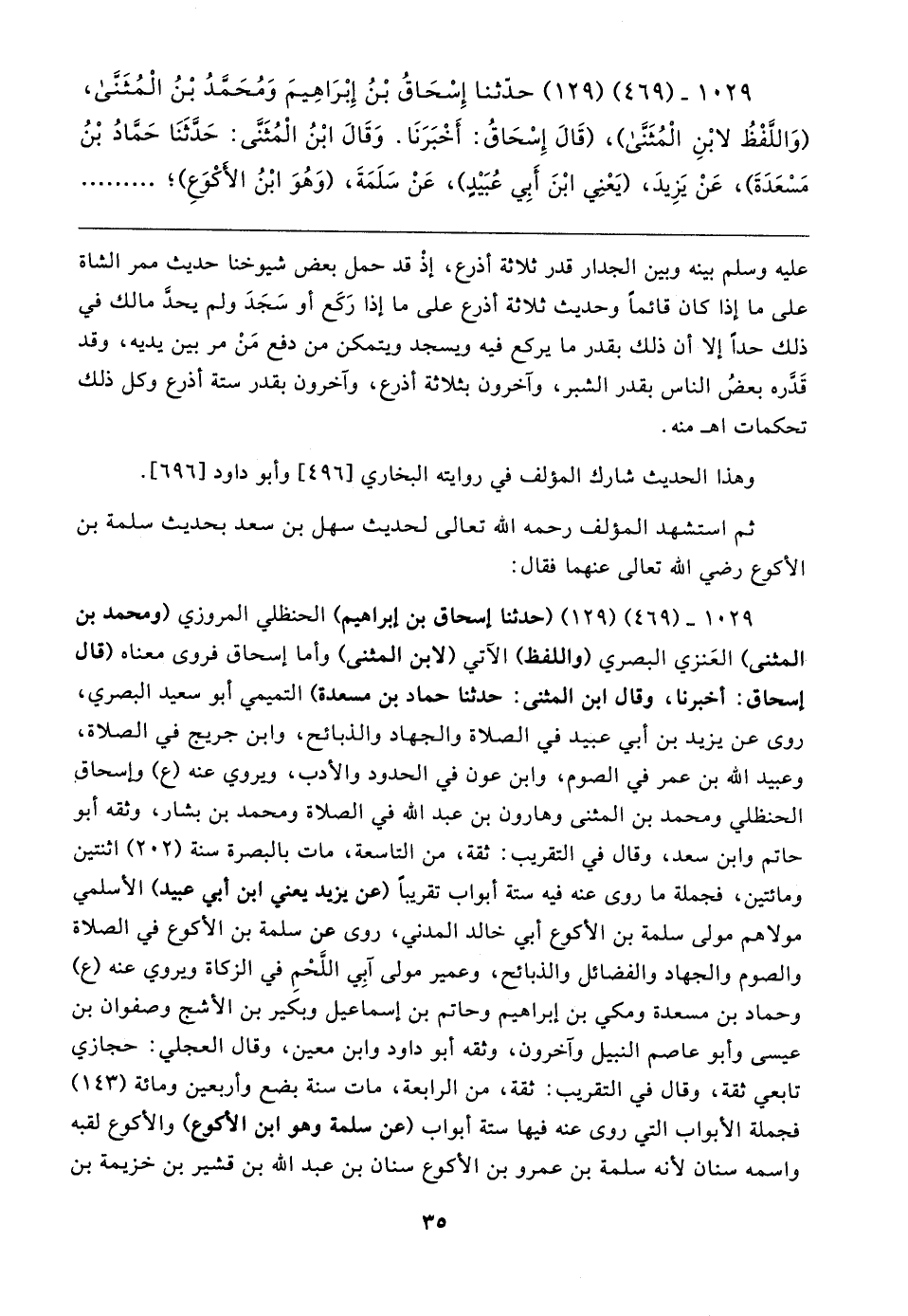 ١٠٢٩ - (٤٦٩) (١٢٩) (حدثنا إسحاق بن إبراهيم) الحنظلي المروزي (ومحمد بن المثنى) العَنزي البصري (واللفظ) الآتي (لابن المثنى) وأما إسحاق فروى معناه (قال إسحاق: أخبرنا، وقال ابن المثنى: حدثنا حماد بن مسعدة) التميمي أبو سعيد البصري، روى عن يزيد بن أبي عبيد في الصلاة والجهاد والذبائح، وابن جريج في الصلاة، وعبيد الله بن عمر في الصوم، وابن عون في الحدود والأدب، ويروي عنه (ع) وإسحاق الحنظلي ومحمد بن المثنى وهارون بن عبد الله في الصلاة ومحمد بن بشار، وثقه أبو حاتم وابن سعد، وقال في التقريب: ثقة، من التاسعة، مات بالبصرة سنة (٢٠٢) اثنتين ومائتين، فجملة ما روى عنه فيه ستة أبواب تقريبًا (عن يزيد يعني ابن أبي عبيد) الأسلمي مولاهم مولى سلمة بن الأكوع أبي خالد المدني، روى عن سلمة بن الأكوع في الصلاة والصوم والجهاد والفضائل والذبائح، وعمير مولى آبِي اللَّحْمِ في الزكاة ويروي عنه (ع) وحماد بن مسعدة ومكي بن إبراهيم وحاتم بن إسماعيل وبكير بن الأشج وصفوان بن عيسى وأبو عاصم النبيل وآخرون، وثقه أبو داود وابن معين، وقال العجلي: حجازي تابعي ثقة، وقال في التقريب: ثقة، من الرابعة، مات سنة بضع وأربعين ومائة (١٤٣) فجملة الأبواب التي روى عنه فيها ستة أبواب (عن سلمة وهو ابن الأكوع) والأكوع لقبه واسمه سنان لأنه سلمة بن عمرو بن الأكوع سنان بن عبد الله بن قشير بن خزيمة بن