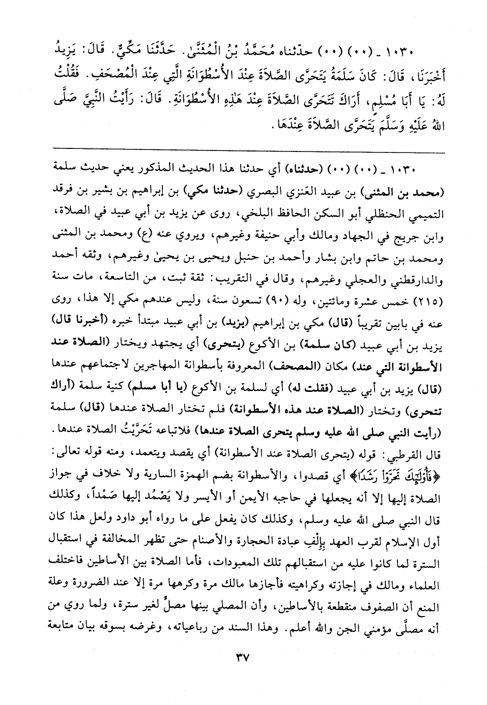 ١٠٣٠ - (٠٠) (٠٠) (حدثناه) أي حدثنا هذا الحديث المذكور يعني حديث سلمة (محمد بن المثنى) بن عبيد العَنزي البصري (حدثنا مكي) بن إبراهيم بن بشير بن فرقد التميمي الحنظلي أبو السكن الحافظ البلخي، روى عن يزيد بن أبي عبيد في الصلاة، وابن جريج في الجهاد ومالك وأبي حنيفة وغيرهم، ويروي عنه (ع) ومحمد بن المثنى ومحمد بن حاتم وابن بشار وأحمد بن حنبل ويحيى بن يحيى وغيرهم، وثقه أحمد والدارقطني والعجلي وغيرهم، وقال في التقريب: ثقة ثبت، من التاسعة، مات سنة (٢١٥) خمس عشرة ومائتين، وله (٩٠) تسعون سنة، وليس عندهم مكي إلا هذا، روى عنه في بابين تقريبًا (قال) مكي بن إبراهيم (بزيد) بن أبي عبيد مبتدأ خبره (أخبرنا قال) يزيد بن أبي عبيد (كان سلمة) بن الأكوع (يتحرى) أي يجتهد ويختار (الصلاة عند الأسطوانة التي عند) مكان (المصحف) المعروفة بأسطوانة المهاجرين لاجتماعهم عندها (قال) يزيد بن أبي عبيد (فقلت له) أي لسلمة بن الأكوع (يا أبا مسلم) كنية سلمة (أراك تتحرى) وتختار (الصلاة عند هذه الأسطوانة) فلم تختار الصلاة عندها (قال) سلمة (رأيت النبي صلى الله عليه وسلم يتحرى الصلاة عندها) فلاتباعه تَحَرَّيتُ الصلاة عندها. قال القرطبي: قوله (يتحرى الصلاة عند الأسطوانة) أي يقصد ويتعمد، ومنه قوله تعالى: {فَأُولَئِكَ تَحَرَّوْا رَشَدًا} أي قصدوا، والأسطوانة بضم الهمزة السارية ولا خلف في جواز الصلاة إليها إلا أنه يجعلها في حاجبه الأيمن أو الأيسر ولا يَصمُد إليها صَمْدًا، وكذلك قال النبي صلى الله عليه وسلم، وكذلك كان يفعل على ما رواه أبو داود ولعل هذا كان أول الإسلام لقرب العهد بِإِلْفِ عبادة الحجارة والأصنام حتى تظهر المخالفة في استقبال السترة لما كانوا عليه من استقبالهم تلك المعبودات، فأما الصلاة بين الأساطين فاختلف العلماء ومالك في إجازته وكراهيته فأجازها مالك مرة وكرهها مرة إلا عند الضرورة وعلة المنع أن الصفوف منقطعة بالأساطين، وأن المصلي بينها مصلٍّ لغير سترة، ولما روي من أنه مصلَّى مؤمني الجن والله أعلم. وهذا السند من رباعياته، وغرضه بسوقه بيان متابعة