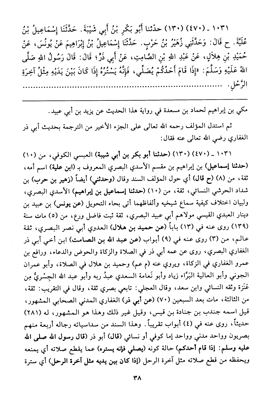 ١٠٣١ - (٤٧٠) (١٣٠) (حدثنا أبو بكر بن أبي شيبة) العبسي الكوفي، من (١٠) (حدثنا إسماعيل) بن إبراهيم بن مقسم الأسدي البصري المعروف بـ (ابن علية) اسم أمه ثقة، من (٨) (ح قال) أي حول المؤلف السند وقال (وحدثني) أيضًا (زهير بن حرب) بن شداد الحرشي النسائي، ثقة، من (١٠) (حدثنا إسماعيل بن إبراهيم) الأسدي البصري، ولبيان اختلاف كيفية سماع شيخيه وألفاظهما أتى بحاء التحويل (عن يونس) بن عبيد بن دينار العبدي القيسي مولاهم أبي عبيد البصري، ثقة ثبت فاضل ورع، من (٥) مات سنة (١٣٩) روى عنه في (١٣) بابا (عن حميد بن هلال) العدوي أبي نصر البصري، ثقة عالم، من (٣) روى عنه في (٩) أبواب (عن عبد الله بن الصامت) ابن أخي أبي ذر الغفاري البصري، روى عن عمه أبي ذر في الصلاة والزكاة والحوض والدعاء، ورافع بن عمرو الغفاري في الزكاة، ويروي عنه (م عم) وحميد بن هلال في الصلاة، وأبو عمران الجوني وأبو العالية البَرَّاء زياد وأبو نَعامة السعدي عبدُ ربه وأبو عبد الله الجِسْريُّ مِن عَنَزة وثقه النسائي وابن سعد، وقال العجلي: تابعي بصري ثقة، وقال في التقريب: ثقة، من الثالثة، مات بعد السبعين (٧٠) (عن أبي ذر) الغفاري المدني الصحابي المشهور، قيل اسمه جندب بن جنادة بن قيس، وقيل غير ذلك وهذا هو المشهور، له (٢٨١) حديثًا، روى عنه في (٤) أبواب تقريبًا. وهذا السند من سداسياته رجاله أربعة منهم بصريون وواحد مدني وواحد إما كوفي أو نسائي (قال) أبو ذر (قال رسول الله صلى الله عليه وسلم: إذا قام أحدكم) حالة كونه (يصلي فإنه يستره) عما يقطع صلاته أي يمنعه ويحفظه من قطع صلاته مثل آخرة الرحل (إذا كان بين يديه مثل آخرة الرحل) أي سترة